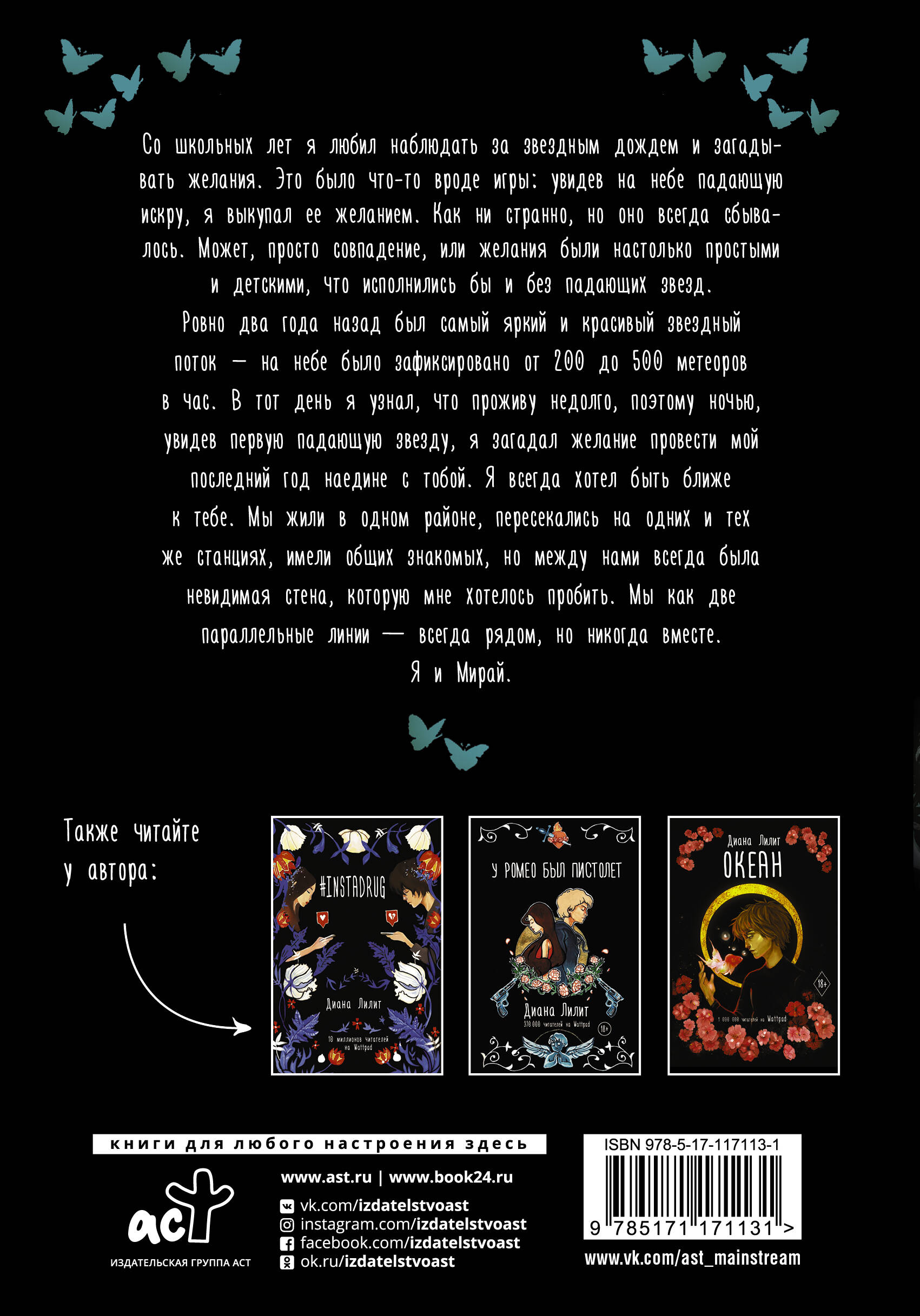 Со школьных лет я любил наблюдать за звездным дождем и загадывать желания. Это было что-то вроде игры: увидев на небе падающую искру, я выкупал ее желанием. Как ни странно, но оно всегда сбывалось. Может, просто совпадение, или желания были настолько простыми и детскими, что исполнились бы и без падающих звезд. Ровно два года назад был самый яркий и красивый звездный поток - на небе было зафиксировано от 200 до 500 метеоров в час. В тот день я узнал, что проживу недолго, поэтому ночью, увидев первую падающую звезду, я загадал желание провести мой последний год наедине с тобой. Я всегда хотел быть ближе к тебе. Мы жили в одном районе, пересекались на одних и тех же станциях, имели общих знакомых, но между нами всегда была невидимая стена, которую мне хотелось пробить. Мы как две параллельные линии - всегда рядом, но никогда вместе. Я и Мирай.| Издательство | Издательство "АСТ" |