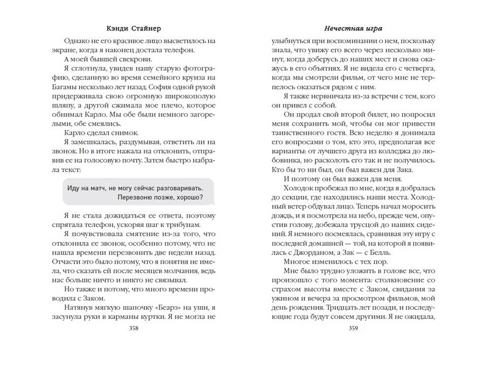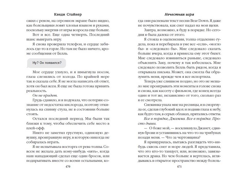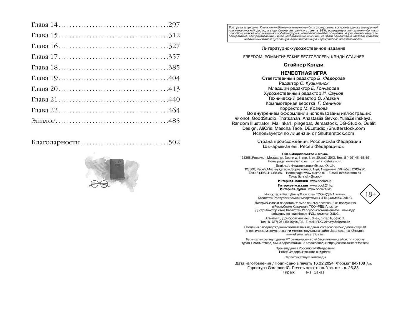 Захватывающий, чувственный и эмоциональный роман Кэнди Стайнер! Сенсация зарубежного книжного сообщества! Невероятная история любви! Для всех фанатов романов о спорте и тропа «от ненависти до любви»! Потрясающая гармония юмора, романтики и драмы под одной обложкой! Герои станут вашими друзьями, столкнутся с трудностями, но обретут долгожданное счастье! Придется по душе фанатам Эммы Скотт и Колин Гувер! Два билета на матч. Одна гениальная идея. Ноль заинтересованности в отношениях. План прост: совершенно незнакомый, горячий, желательно веселый и одинокий парень будет занимать одно из мест на стадионе на каждой игре сезона. А я займу место рядом с ним. Одна игра - одно заранее спланированное свидание. Мне не удалось придумать лучшего способа использовать билеты, которые я купила для бывшего. Я люблю действовать согласно плану, и моя задумка должна увенчаться успехом. Так я считала, пока в моей жизни не появился Зак. Самонадеянный, властный. И великолепный… Он меня бесит. Зак способен привлечь любую девушку, у которой бьется сердце, а мое ускоряется каждый раз, стоит ему заговорить. Но, как я уже сказала, я люблю строить планы - и не дам Заку их нарушить. Одна ночь. Одна игра. И вот, его время истекло. Зак может попытаться изменить правила, но правда такова: он не сможет победить, если будет играть нечестно. «Кэнди Стайнер заработала тачдаун, создав "Нечестную игру". Мой однозначный фаворит, в лучшие книги года!» - Goodreads| Издательство | ООО "Издательство "Эксмо" |