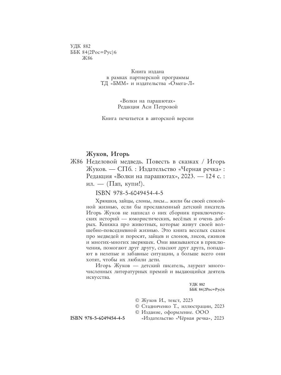 Хрюшки, зайцы, слоны, лисы... жили бы своей спокойной жизнью, если бы прославленный детский писатель Игорь Жуков не написал о них сборник приключенческих историй - юмористических, весёлых и очень добрых. Книжка про животных, которые живут своей волшебно-повседневной жизнью. Это книга веселых сказок про медведей и поросят, зайцев и слонов, лисов, ежиков и многих-многих зверюшек. Они ввязываются в приключения, помогают друг другу, спасают друг друга, попадают в нелепые и забавные ситуации, а больше всего они хотят, чтобы их любили дети. Игорь Жуков - детский писатель, лауреат многочисленных литературных премий и выдающийся деятель искусства.| Издательство | Волки на парашютах |