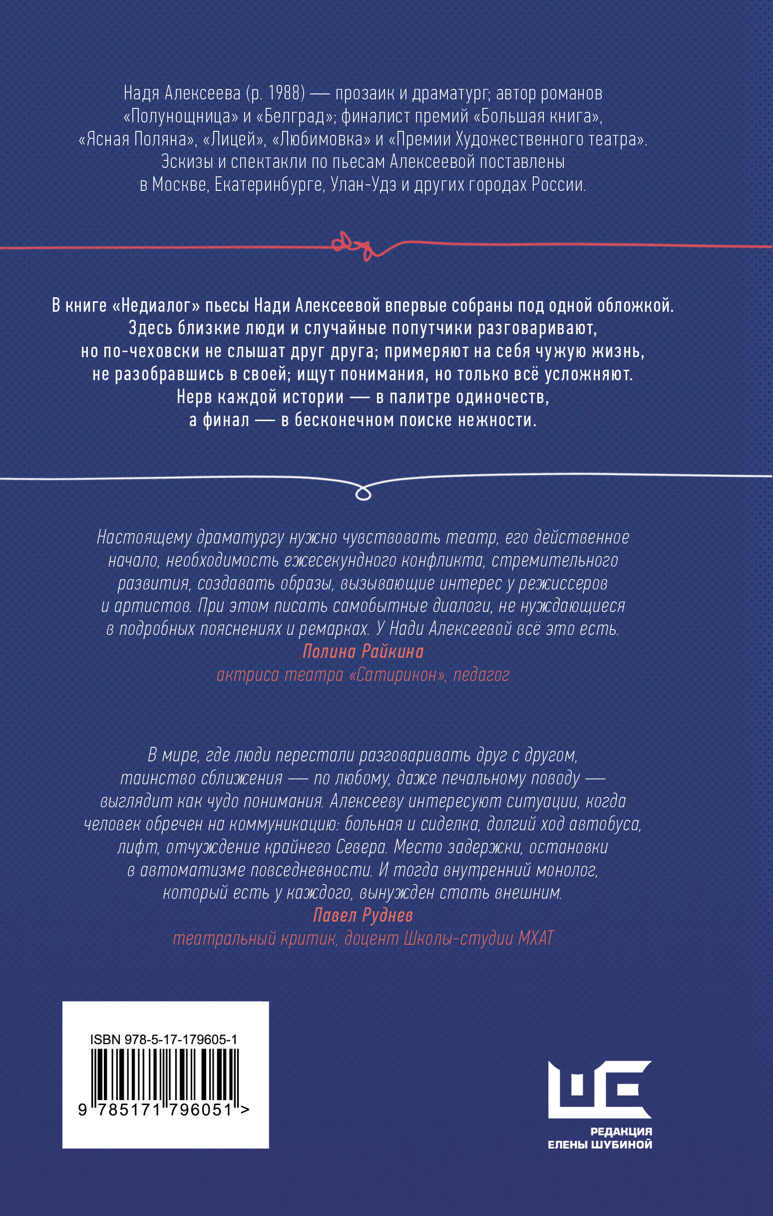 - Автор романов «Полунощница» и «Белград», Надя Алексеева не только отличный прозаик, но и драматург. Она училась у Николая Коляды, Дмитрия Данилова, ее пьесы и эскизы ставятся в разных городах России. - Новая книга в серии современной драматургии «По ролям». - Книга открывается статьей Нади, в которой она рассказывает о своем пути к театру!| Издательство | Издательство "АСТ" |