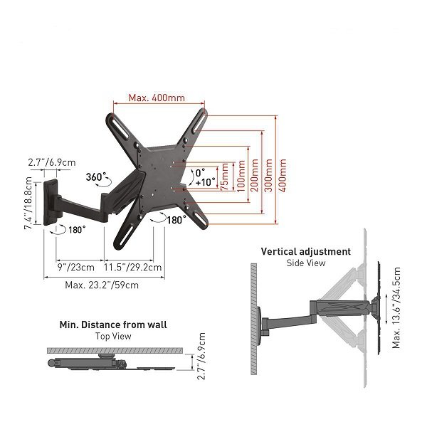 <p>Для размера экрана: 23-55"<br>Стандарт VESA: 100x100, 200x100, 100x200, 200x200,<br>400х200, 400х400 мм<br>Наклон: -5°~+15°<br>Поворотный: +90°~-90°<br>Уровень экрана +5° ~ -5°<br>Расстояние до стены: 61-565 мм<br>Вертикальный диапазон движения: 345 мм<br>Максимальная нагрузка: 30 кг<br>Вес нетто: 5,45 кг<br>Размер мм: 370x80x505 мм (Ш*В*Г)<br>Черный цвет</p>