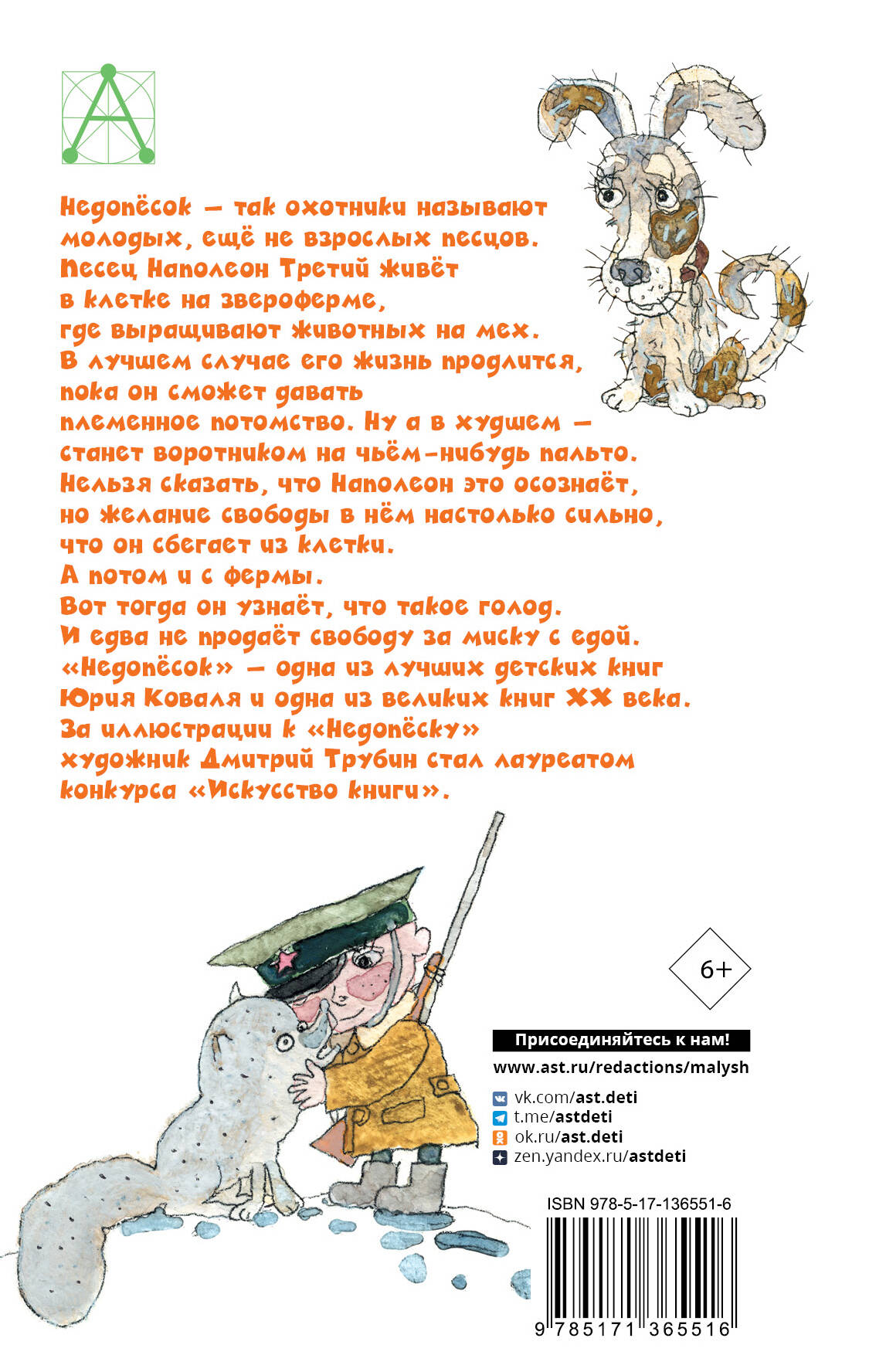 Недопёсок - так охотники называют молодых, ещё не взрослых песцов. Песец Наполеон Третий живёт в клетке на звероферме, где выращивают животных на мех. В лучшем случае его жизнь продлится, пока он сможет давать племенное потомство. Ну а в худшем станет воротником на чьём-нибудь пальто. Нельзя сказать, что Наполеон это осознаёт, но желание свободы в нём настолько сильно, что он сбегает из клетки. А потом и с фермы. Вот тогда он узнаёт, что такое голод. И едва не продаёт свободу за миску с едой. "Недопёсок" - одна из лучших детских книг Юрия Коваля и одна из великих книг ХХ века. За иллюстрации к "Недопёску" художник Дмитрий Трубин стал лауреатом конкурса "Искусство книги". Для младшего школьного возраста.| Издательство | ИЗДАТЕЛЬСТВО "АСТ" |