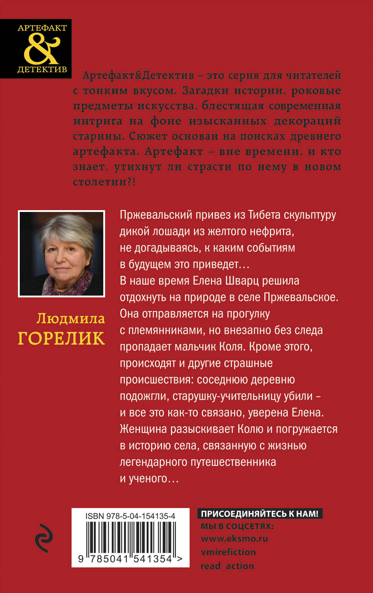 Новый роман Людмилы Горелик из серии «Артефакт&Детектив» о старинном артефакте - нефритовой лошади Пржевальского! Людмила Горелик рассказала о выборе исторического героя для своего романа: «Драматическая судьба Пржевальского настолько насыщена яркими событиями, что не сделать его героем романа было просто невозможно! Особенно заинтриговал меня гениальный путешественник, когда я узнала, что Чехов восхищался им, что поездка на Сахалин отчасти спровоцирована чеховским увлечением личностью Пржевальского. Историческую часть мне было особенно увлекательно писать, потому что я люблю этот период - время Тургенева, Чехова, Фета. Не знаю, как в жизни, а в моем романе Пржевальский испытал их облагораживающее влияние». Пржевальский привез из Тибета скульптуру дикой лошади из желтого нефрита, не догадываясь, к каким событиям в будущем это приведет… В наше время Елена Шварц решила провести отдых на природе в селе Пржевальское. Она отправляется на прогулку с племянниками, но внезапно без следа пропадает мальчик Коля. Кроме этого происходят и другие страшные происшествия: соседнюю деревню подожгли, старушку-учительницу убили - и все это как-то связано, уверена Елена. Женщина разыскивает Колю и погружается в историю села, связанного с жизнью легендарного путешественника и ученого… История жизни Пржевальского переплетается с детективным сюжетом в новом романе Людмилы Горелик «Нефритовая лошадь Пржевальского».| Издательство | ООО "Издательство "Эксмо" |