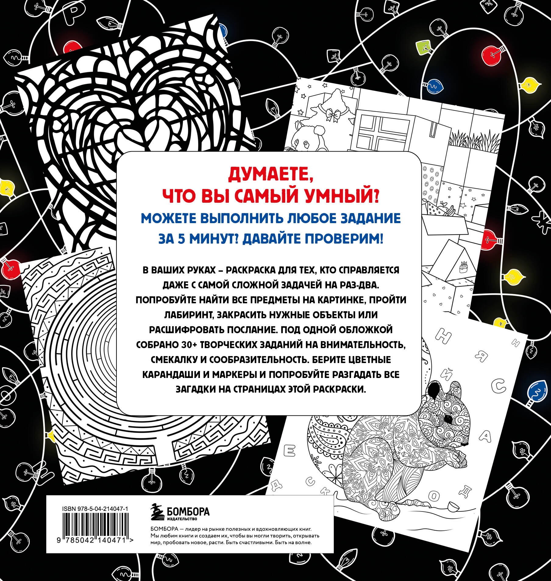 Я тут самый умный! Если вы так же смело можете сказать о себе, то эта книга точно для вас. На страницах этой книги-раскраски мы собрали самые интересные и запутанные задания, чтобы проверить каждого, кто рискнет к ним приступить. Сможете ли вы самостоятельно разгадать шифр? Выбраться из лабиринта? А найти посылку на почте? Вместе с этой раскраской вы сможете не только раскрыть свой творческий потенциал, но и потренировать свою смекалку.| Издательство | ООО "Издательство "Эксмо" |