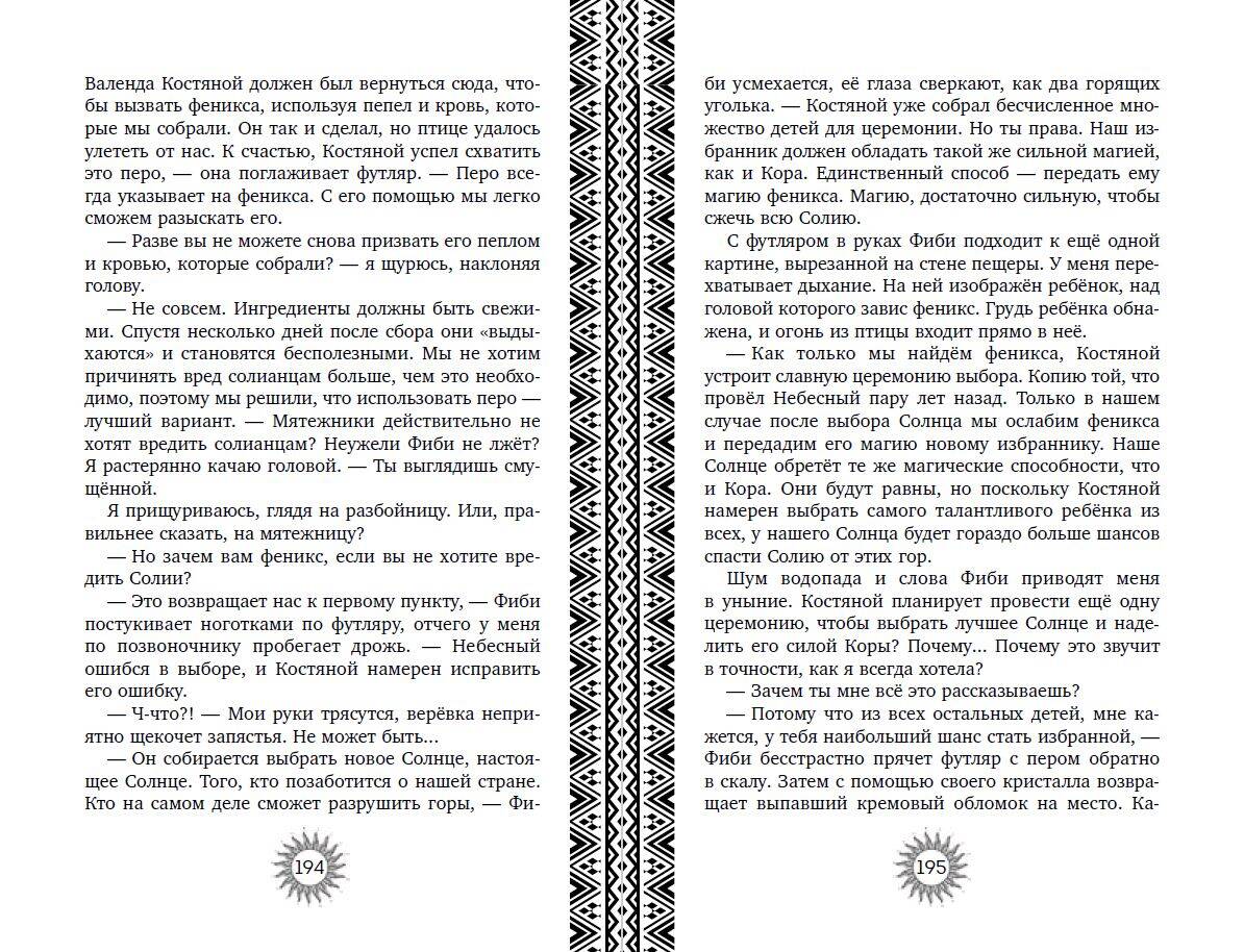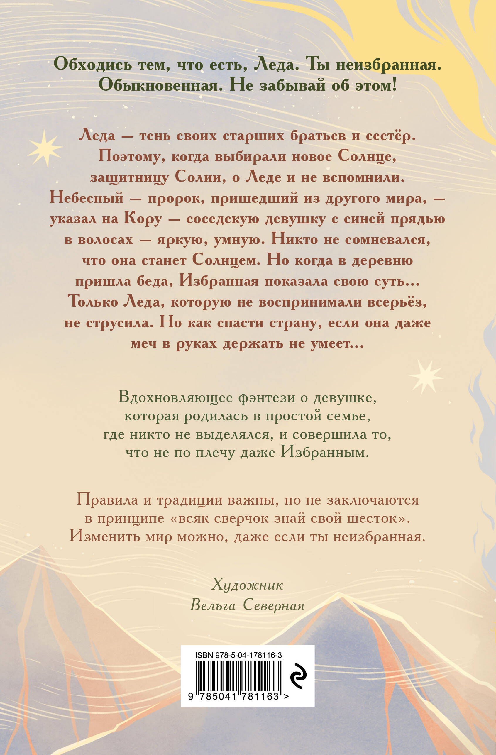 Леда - тень своих старших братьев и сестёр. Поэтому, когда выбирали новое Солнце, защитницу Солии, о Леде и не вспомнили. Небесный - пророк, пришедший из другого мира - указал на Кору, соседскую девушку с синей прядью в волосах - яркую, умную. Никто не сомневался, что она станет Солнцем. Но когда в деревню пришла беда, Избранная показала свою суть… И только Леда, которую никогда не воспринимали всерьёз, не струсила. Но как ей спасти страну, если она даже меч в руках держать не умеет... Вдохновляющее фэнтези о девушке, которая родилась в простой семье, где никто не выделялся, и совершила то, что не по плечу даже Избранным. Правила и традиции важны, но не заключаются в принципе «всяк сверчок знай свой шесток». Изменить мир можно, даже если ты обычная девушка.