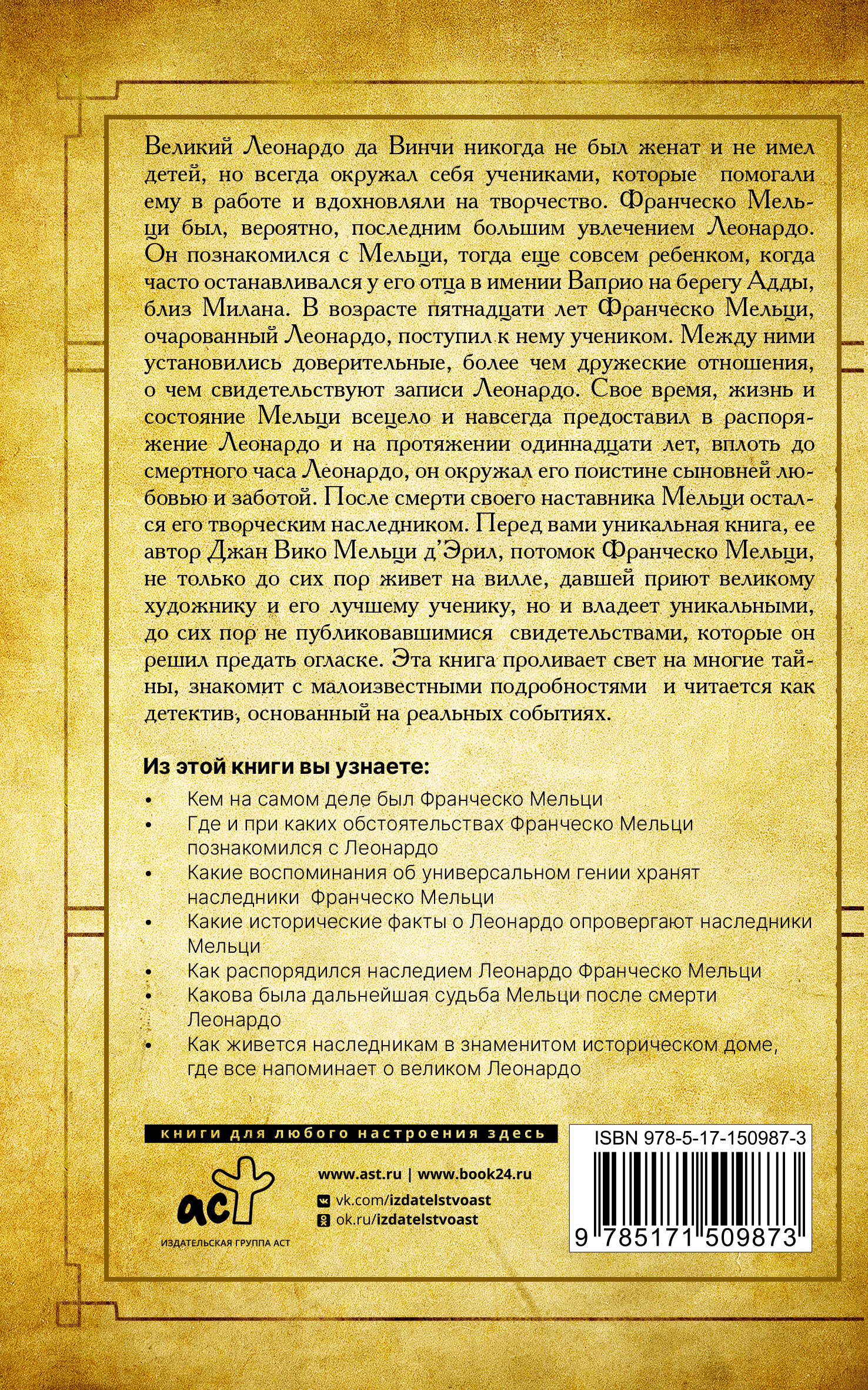 В своей книге потомок ученика и наследника Леонардо - Джан Вико Мельци Мельци д'Эрил рассказывает о творчестве универсального гения, проливает свет на многие тайны его жизни. Для самого широкого круга читателей.| Издательство | ИЗДАТЕЛЬСТВО "АСТ" |