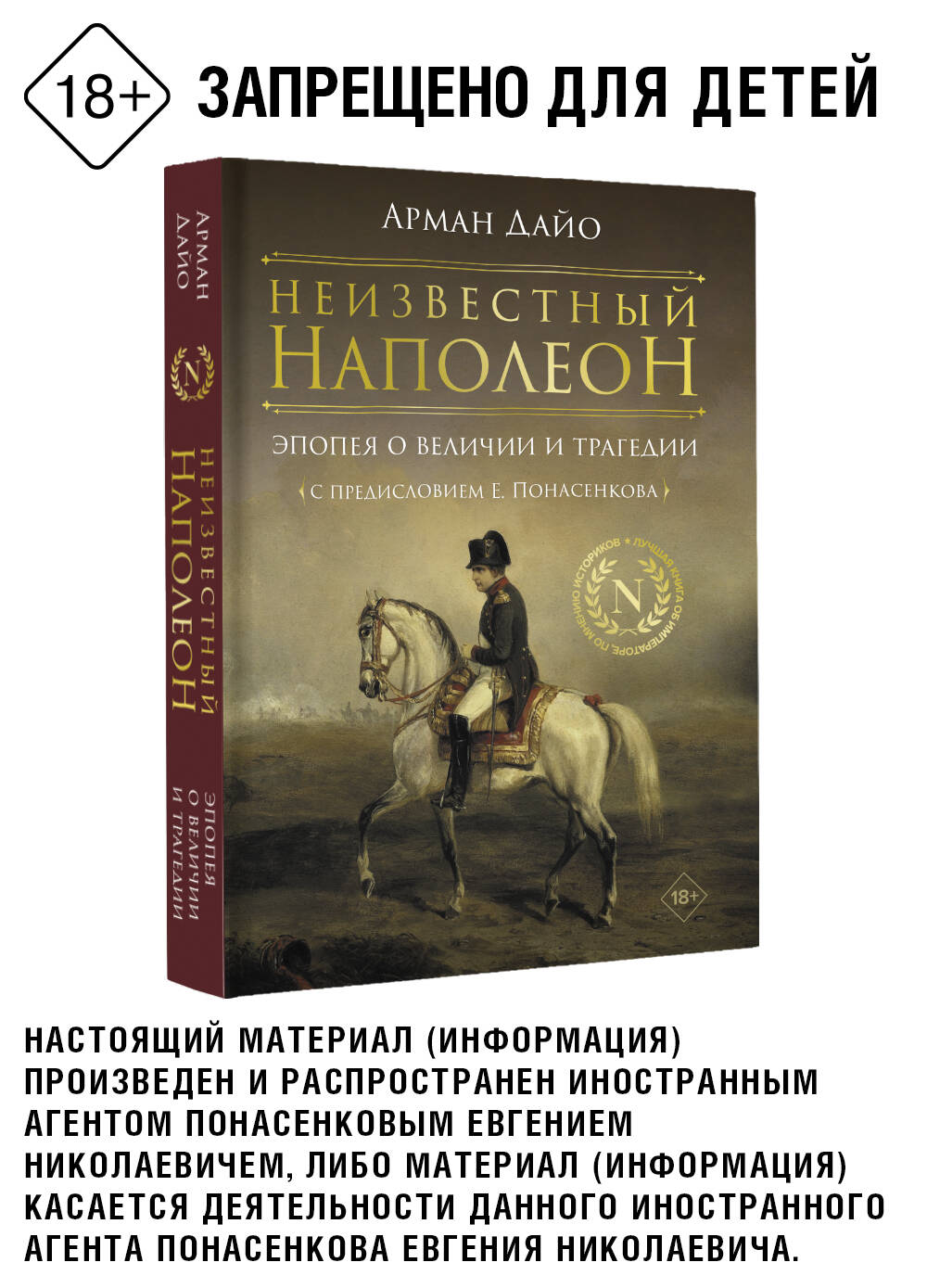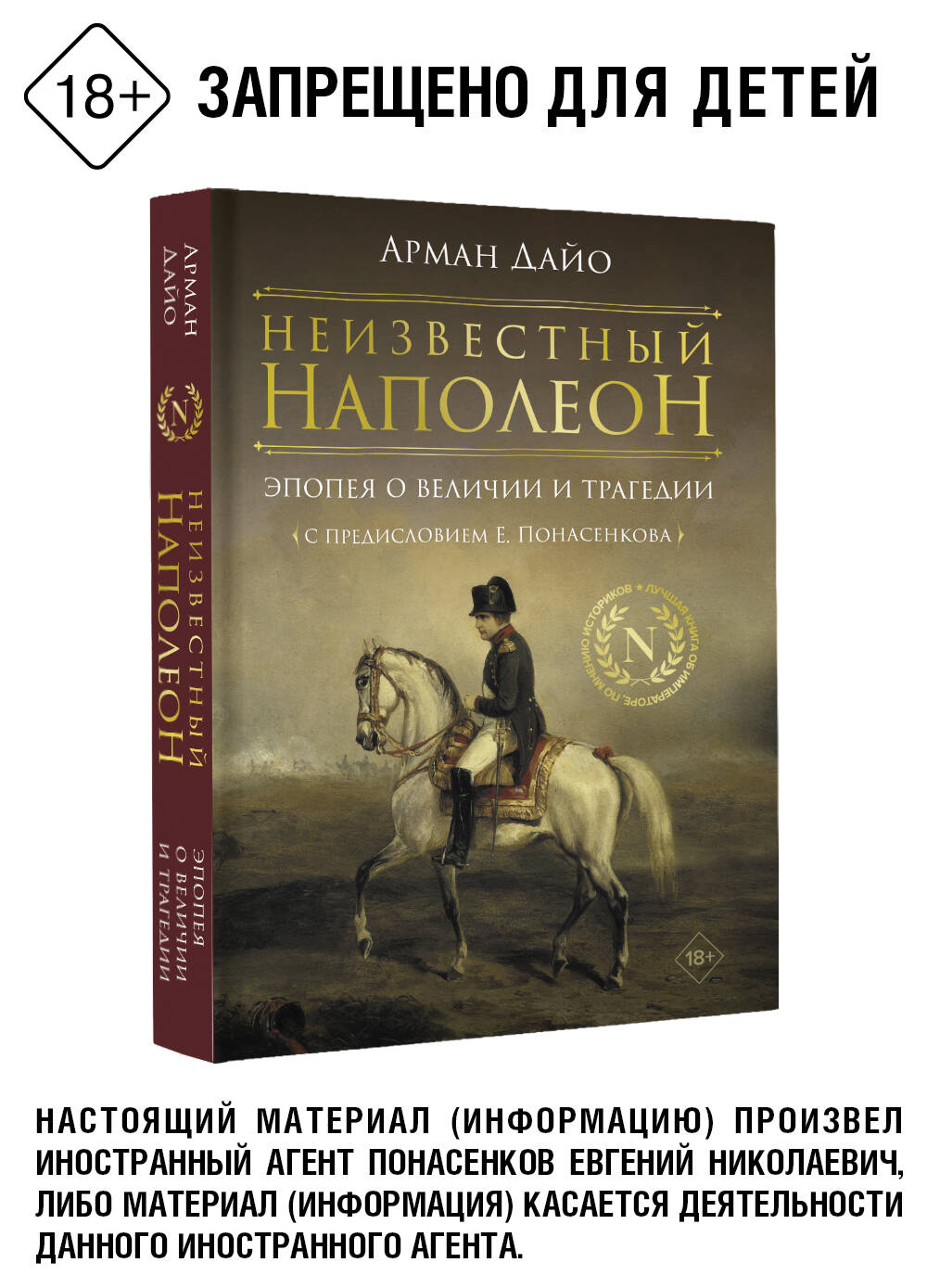 НАСТОЯЩИЙ МАТЕРИАЛ (ИНФОРМАЦИЯ) ПРОИЗВЕДЕН И РАСПРОСТРАНЕН ИНОСТРАННЫМ АГЕНТОМ ПОНАСЕНКОВЫМ ЕВГЕНИЕМ НИКОЛАЕВИЧЕМ, ЛИБО МАТЕРИАЛ (ИНФОРМАЦИЯ) КАСАЕТСЯ ДЕЯТЕЛЬНОСТИ ДАННОГО ИНОСТРАННОГО АГЕНТА ПОНАСЕНКОВА ЕВГЕНИЯ НИКОЛАЕВИЧА. Предисловие к этой книге написал знаменитый ученый-историк, ведущий специалист по эпохе Наполеона, Евгений Понасенков. Книга Армана Дайо, изданная когда-то на веленевой бумаге, с золотым обрезом, тиражом 200 экземпляров, - ныне не просто редчайшая редкость, но предмет охоты богатых библиофилов на аукционах. Чем же может привлечь искушенного нынешнего читателя еще одна книга о Наполеоне, к тому же впервые вышедшая аж в XIX веке? Прежде всего - абсолютной достоверностью. Беспристрастностью. Романтическим отношением к своему герою. Главная же заслуга Армана Дайо в том, что за долгие годы, предшествовавшие созданию его блистательного труда, он сумел описать и представить читателю около 600 уникальных художественных реликвий - картин, гравюр, скульптур, предметов быта, напрямую связанных с именем того, чей прах покоится под сводами Собора в парижском Доме Инвалидов.| Издательство | Издательство "АСТ" |