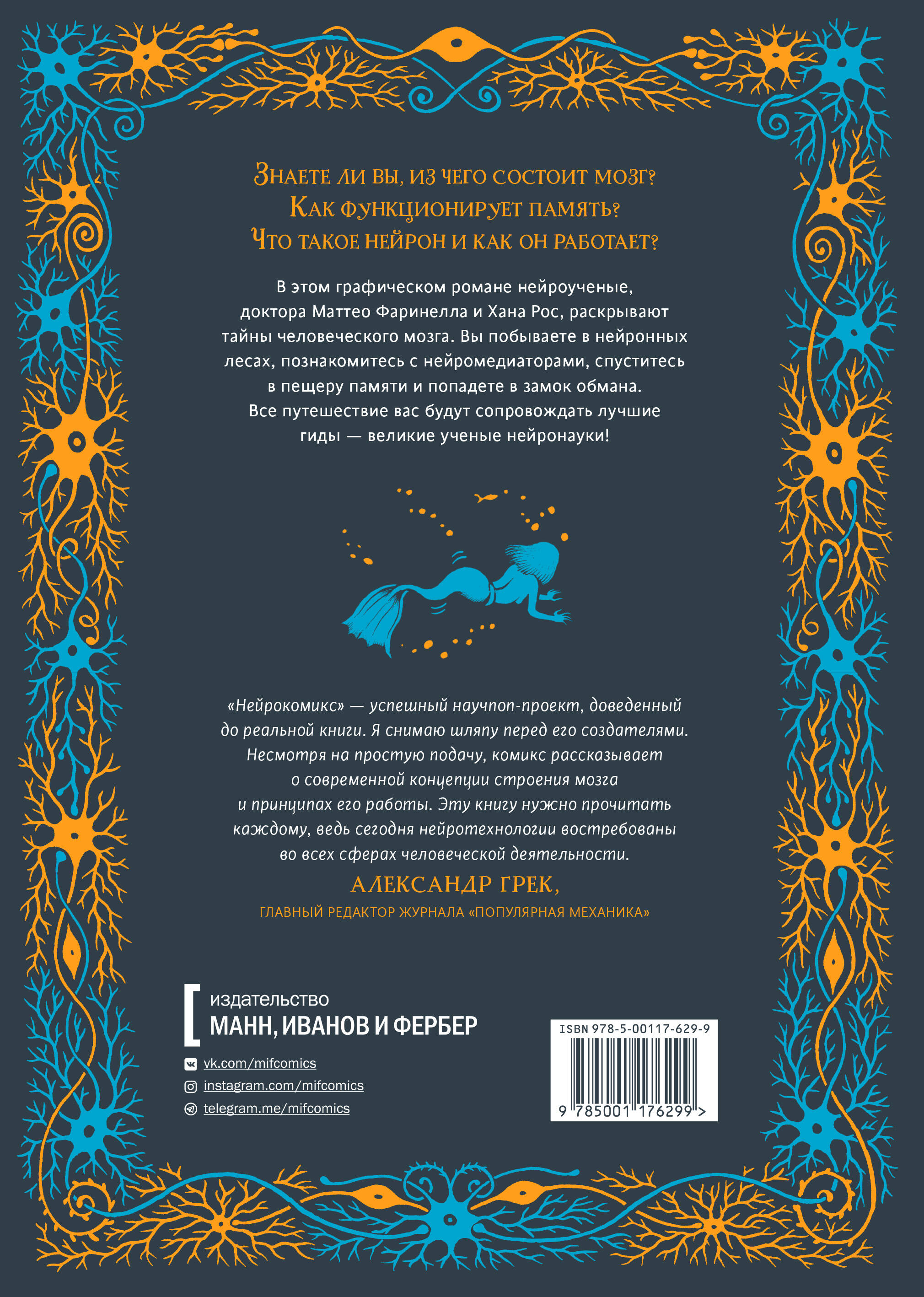 Знаете ли вы, из чего состоит мозг? Как функционирует память? Что такое нейрон и как он работает? В этом графическом романе нейроученые, доктора Маттео Фаринелла и Хана Рос, раскрывают тайны человеческого мозга. Вы побываете в нейронных лесах, познакомитесь с нейромедиаторами, спуститесь в пещеру памяти и попадете в замок обмана. Все путешествие вас будут сопровождать лучшие гиды - великие ученые нейронауки!| Издательство | МАНН, ИВАНОВ И ФЕРБЕР ООО |