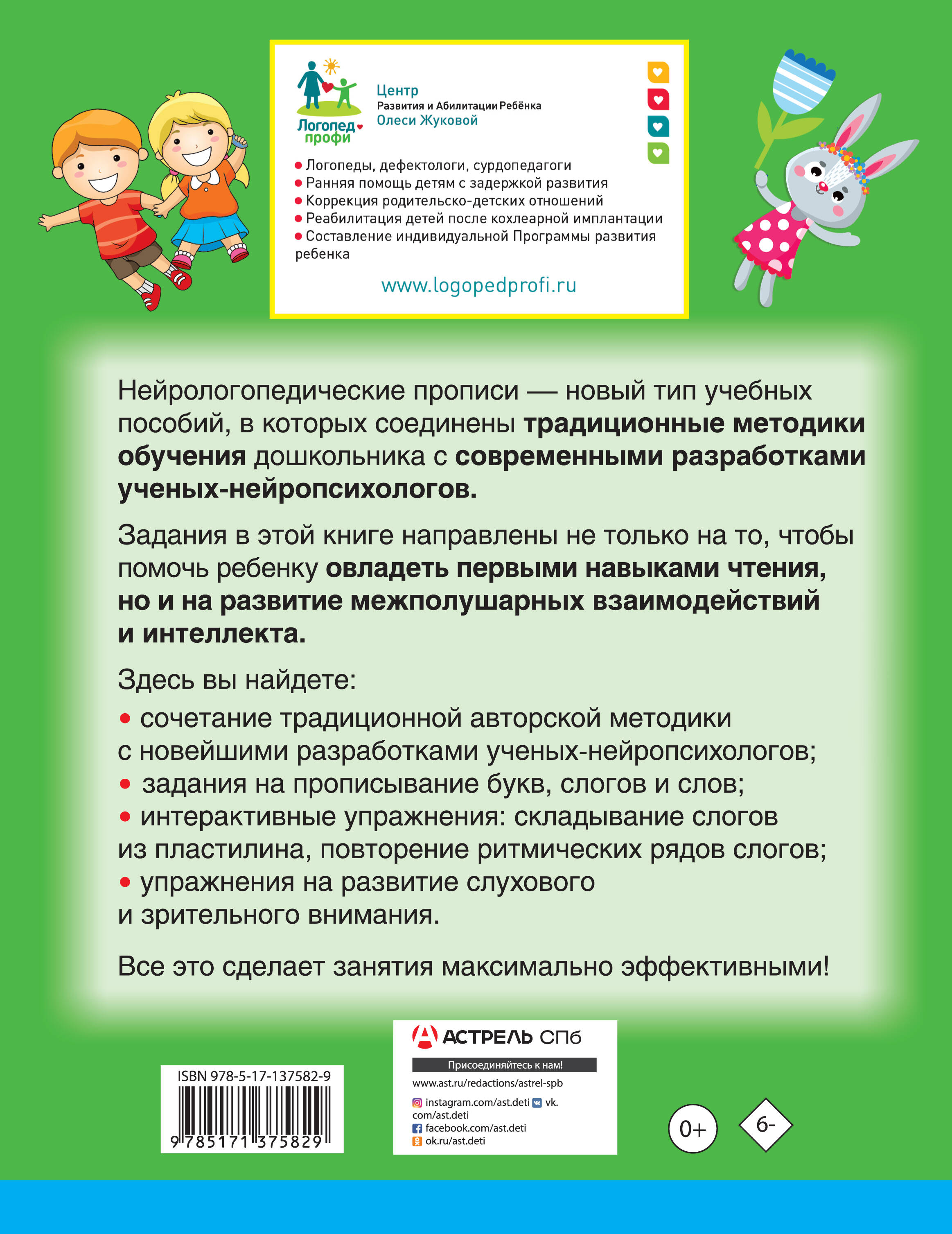 Нейрологопедические прописи - новый тип учебных пособий, в которых соединены традиционные методики обучения и развития дошкольника с современными практическими разработками ведущих российских ученых-нейропсихологов. Занятие по этой книге поможет дошкольнику овладеть первыми навыками чтения, научиться читать слоги и простые слова. Помимо привычных заданий (прописывание слогов и слов), здесь вы найдете интерактивные упражнения: складывание слогов из пластилина, повторение ритмических рядов слогов, а также упражнения на развитие слухового и зрительного внимания. Для дошкольного возраста.| Издательство | ИЗДАТЕЛЬСТВО "АСТ" |