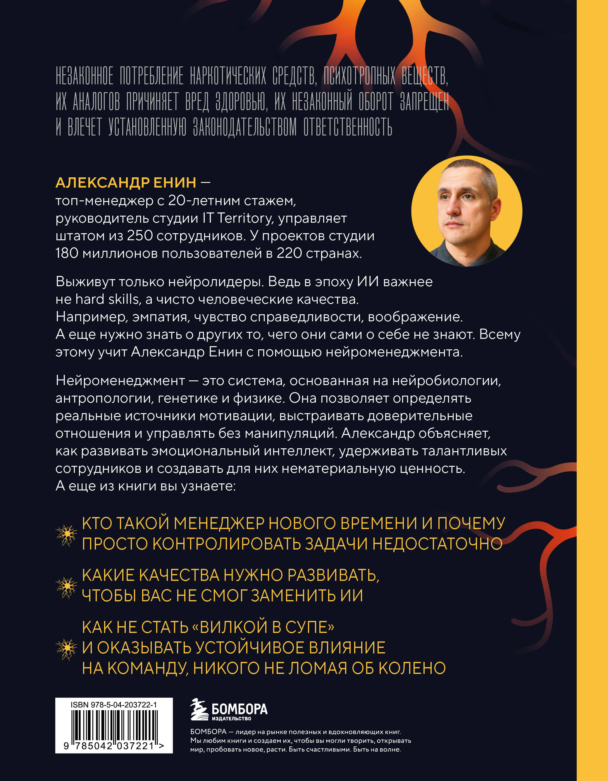 НЕЗАКОННОЕ ПОТРЕБЛЕНИЕ НАРКОТИЧЕСКИХ СРЕДСТВ, ПСИХОТРОПНЫХ ВЕЩЕСТВ, ИХ АНАЛОГОВ ПРИЧИНЯЕТ ВРЕД ЗДОРОВЬЮ, ИХ НЕЗАКОННЫЙ ОБОРОТ ЗАПРЕЩЕН И ВЛЕЧЕТ УСТАНОВЛЕННУЮ ЗАКОНОДАТЕЛЬСТВОМ ОТВЕТСТВЕННОСТЬ. Выживут только нейролидеры. Ведь в эпоху ИИ важнее не hard skills, а чисто человеческие качества. Например, эмпатия, чувство справедливости, воображение. А еще нужно знать о других то, чего они сами о себе не знают. Всему этому учит Александр Енин с помощью нейроменеджмента. Нейроменеджмент - это система, основанная на нейробиологии, антропологии, генетике и физике. Она позволяет определять реальные источники мотивации, выстраивать доверительные отношения и управлять без манипуляций. Александр объясняет, как развивать эмоциональный интеллект, удерживать талантливых сотрудников и создавать для них нематериальную ценность. А еще из книги вы узнаете: - кто такой менеджер нового времени и почему просто контролировать задачи недостаточно; - какие качества нужно развивать, чтобы вас не смог заменить ИИ; - как не стать «вилкой в супе» и оказывать устойчивое влияние на команду, никого не ломая об колено. Александр Енин - топ-менеджер с 20-летним стажем, руководитель студии IT Territory, управляет штатом из 250 сотрудников. У проектов студии 180 миллионов пользователей в 220 странах.| Издательство | ООО "Издательство "Эксмо" |