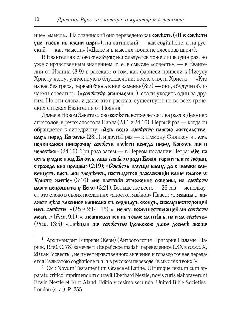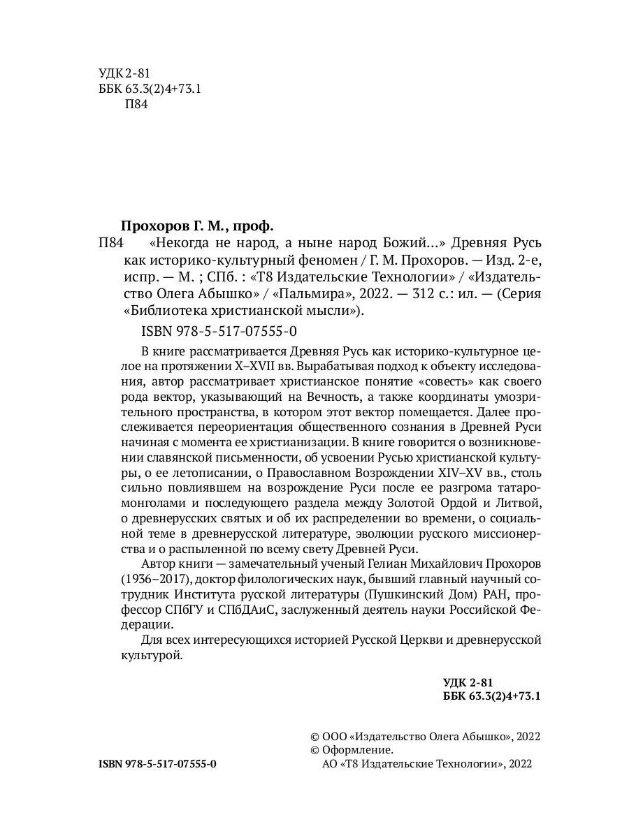 В книге рассматривается Древняя Русь как историко-культурное целое на протяжении X-XVII вв. Вырабатывая подход к объекту исследования, автор рассматривает христианское понятие «совесть» как своего рода вектор, указывающий на Вечность, а также координаты умозрительного пространства, в котором этот вектор помещается. Далее прослеживается переориентация общественного сознания в Древней Руси, начиная с момента ее христианизации. В книге говорится о возникновении славянской письменности, об усвоении Русью христианской культуры, о ее летописании, о Православном Возрождении XIV-XV вв., столь сильно повлиявшим на возрождение Руси после ее разгрома татаро-монголами и последующим разделом между Золотой Ордой и Литвой, о древнерусских святых и об их распределении во времени, о социальной теме в древне-русской литературе, эволюции русского миссионерства и о распыленной по всему свету Древней Руси настоящего времени. Автор книги - замечательный русский ученый Гелиан Михайлович Прохоров (1936?2017), доктор филологических наук, бывший главный научный сотрудник Института русской литературы (Пушкинский Дом) РАН, профессор СПбГУ и СПбДАиС, заслуженный деятель науки. Для всех интересующихся историей Русской Церкви и древнерусской культурой.| Издательство | Т8 RUGRAM |