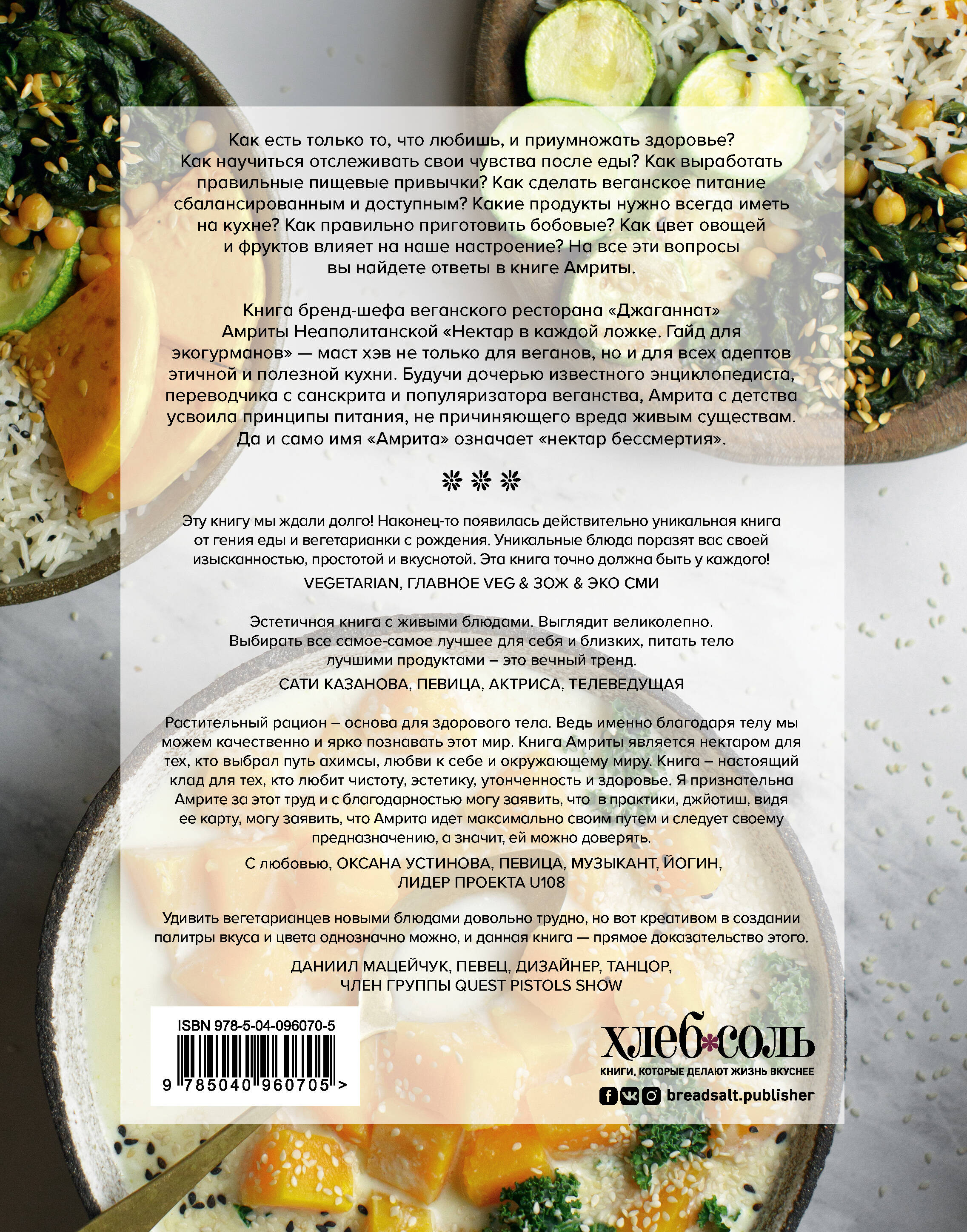 Книга бренд-шефа веганского ресторана «Джаганнат» Амриты Неаполитанской «Нектар в каждой ложке. Гайд для экогурманов» - настоящий маст хэв не только для веганов, но и для всех адептов этичной и полезной еды. Она не просто научит нас правильно и вкусно готовить, но поможет понять собственный организм. Ведь Амрита призывает заново прислушаться к своим ощущениям и начать питаться тем, что мы действительно любим, приумножая здоровье. А еще она предлагает понять базовые принципы веганской кухни и правильные сочетания продуктов и дает рецепты на каждый день. И автору хочется доверять. Ведь восьмилетние странствия по свету, а также непрерывное обучение у супермастеров кулинарии из Индии, Таиланда, Азии и Европы, и, конечно, огромная практика, сделали его настоящим изобретателем новых веганских блюд. Кстати, само имя «Амрита» означает «нектар бессмертия». «Завтраки», «Горячее», «Супы», «Салаты и закуски», «Десерты» - названия разделов вроде бы привычны. Но знаете ли вы, как приготовить омлет из чечевицы, «черную икру» из амаранта, зеленый суп со сметаной из подсолнечника, растительную моцареллу или сладости из зеленой гречки? Если нет, просто откройте книгу Амриты, следуйте ее пошаговым инструкциям, вдохновляйтесь великолепными фото - и все точно получится!| Издательство | ООО "Издательство "Эксмо" |