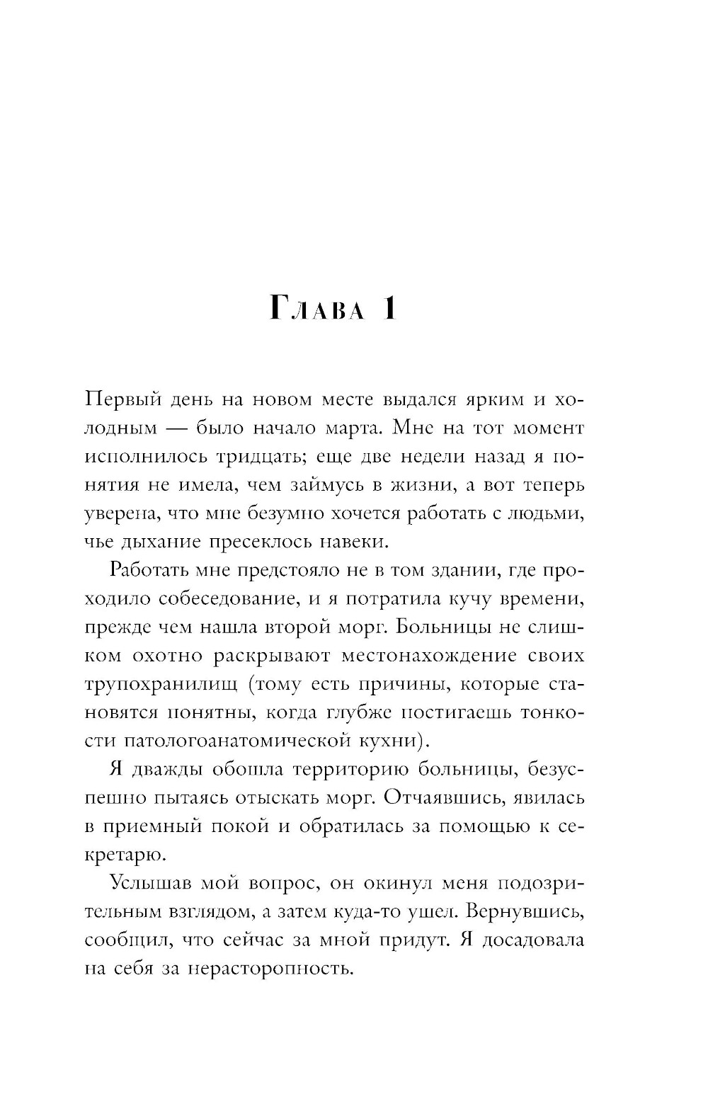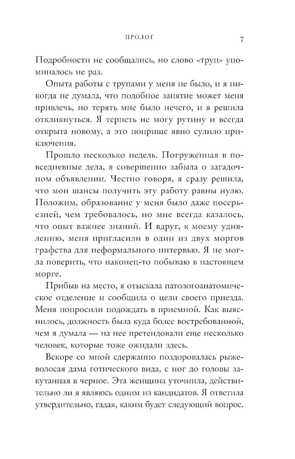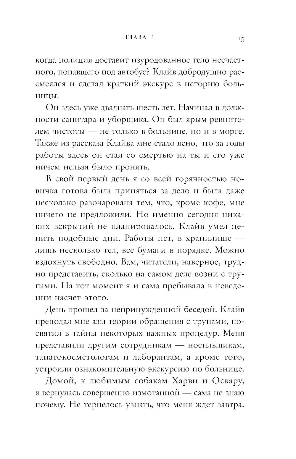 30-летняя британка, которой надоела работа в Национальной службе здравоохранения, устраивается стажером в больничный морг. В свой первый год работы она учится проводить вскрытие, определять причину смерти, общаться с убитыми горем родственниками и сомнительными гробовщиками. Автор откровенно рассказывает о себе и своей работе, сообщая порой жуткие подробности о человеческом теле. В книге подробно описано, как и с помощью чего делается вскрытие, какие правила при этом нужно соблюдать и какие ошибки допускают патологоанатомы. Автор не теряет веры в людей и продолжает ценить жизнь, ежедневно сталкиваясь с ситуациями, от которых остальные теряют дар речи.| Издательство | Эксмо |