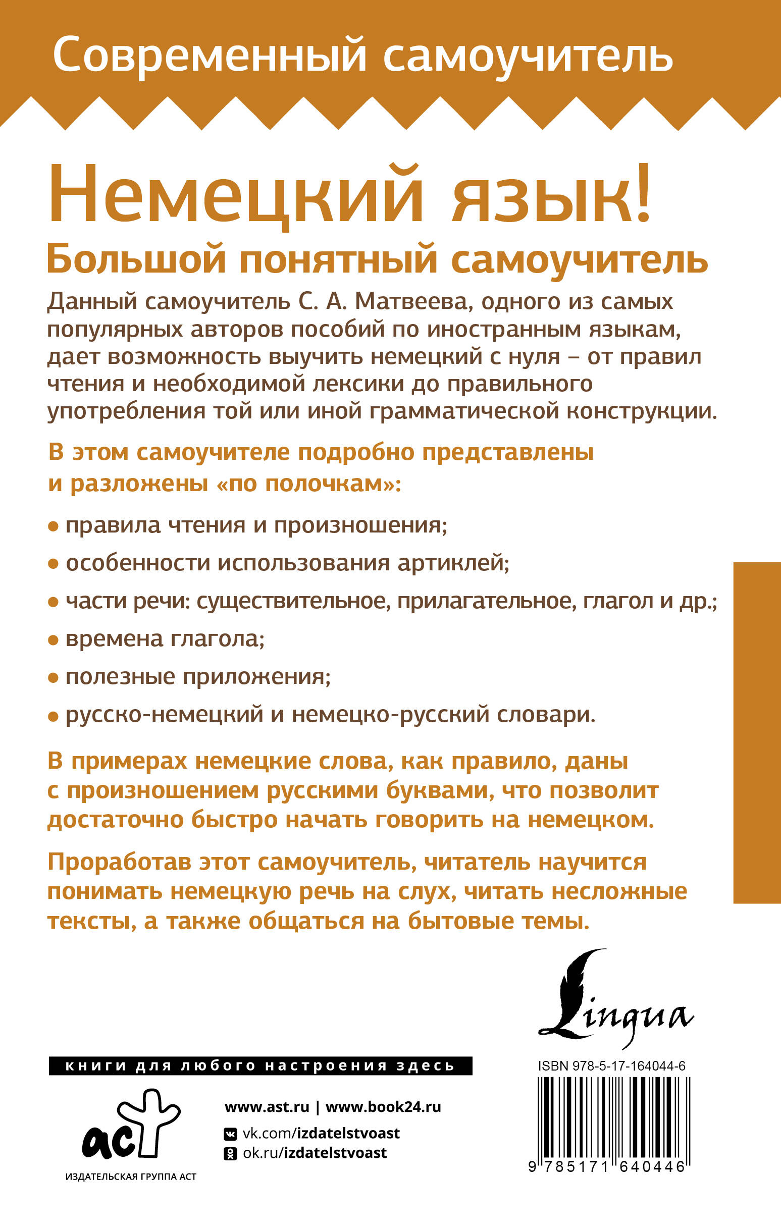 Сергей Александрович Матвеев - самый продаваемый автор в нише иностранных языков, полиглот, автор учебных пособий по иностранным языкам. Данный самоучитель дает возможность выучить немецкий язык с нуля, постепенно осваивая все самое необходимое. В книге даны основы немецкого произношения, рассказано о правилах чтения, причем на протяжении всей книги большинство немецких слов и предложений сопровождаются транскрипцией русскими буквами. Подробно представлены части речи - существительное, прилагательное, глагол и др. Основной материал дополнен полезным приложением, а также русско-немецким и немецко-русским словарем. Пособие предназначено для широкого круга лиц, изучающих немецкий язык. Материал книги соответствует уровням А1-А2 и подойдет для начинающих обучение.| Издательство | Издательство "АСТ" |