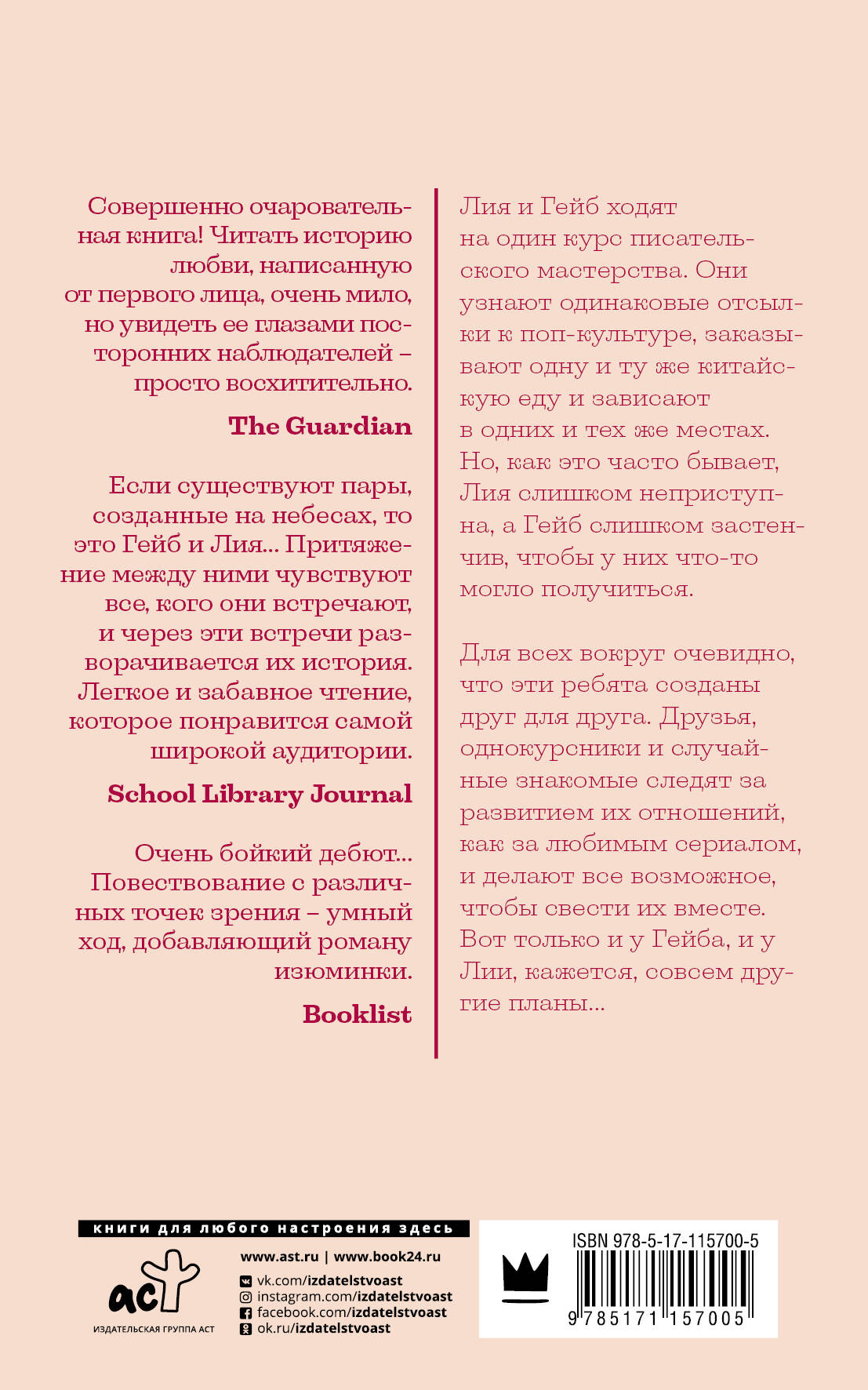 Лия и Гейб ходят на один курс писательского мастерства. Они узнают одинаковые отсылки к поп-культуре, заказывают одну и ту же китайскую еду и зависают в одних и тех же местах. Но, как это часто бывает, Лия слишком неприступна, а Гейб слишком застенчив, чтобы у них что-то могло получиться. Для всех вокруг очевидно, что эти ребята созданы друг для друга. Друзья, однокурсники и случайные знакомые следят за развитием их отношений, как за любимым сериалом, и делают все возможное, чтобы свести их вместе. Вот только и у Гейба, и у Лии, кажется, совсем другие планы…