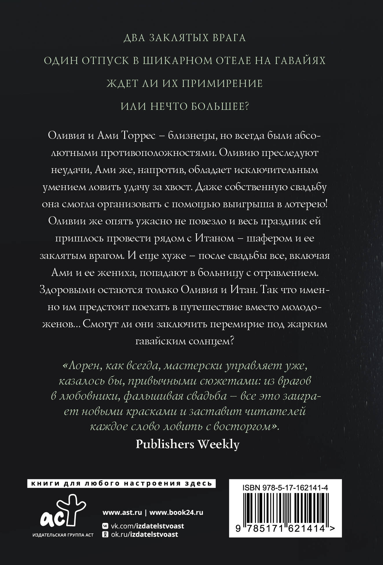 Оливия и Ами Торрес - близнецы, но всегда были абсолютными противоположностями. Оливию преследуют неудачи, Ами же, напротив, обладает исключительным умением ловить удачу за хвост. Даже собственную свадьбу она смогла организовать с помощью выигрыша в лотерею! Оливии же опять ужасно не повезло и весь праздник ей пришлось провести рядом с Итаном - шафером и ее заклятым врагом. И еще хуже - после свадьбы все, включая Ами и ее жениха, попадают в больницу с отравлением. Здоровыми остаются только Оливия и Итан. Так что именно им предстоит поехать в путешествие вместо молодоженов… Смогут ли они заключить перемирие под жарким гавайским солнцем?| Издательство | Издательство "АСТ" |