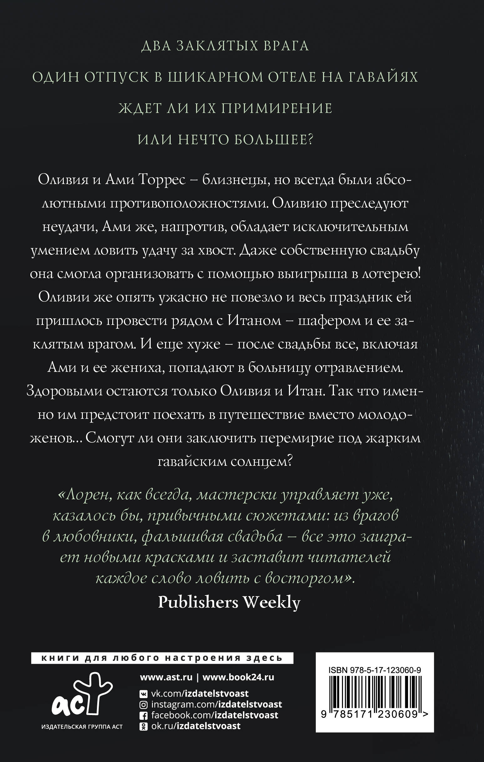 Оливия и Ами Торрес - близнецы, но всегда были абсолютными противоположностями. Оливию преследуют неудачи, Ами же, напротив, обладает исключительным умением ловить удачу за хвост. Даже собственную свадьбу она смогла организовать с помощью выигрыша в лотерею! Оливии же опять ужасно не повезло и весь праздник ей пришлось провести рядом с Итаном - шафером и ее за- клятым врагом. И еще хуже - после свадьбы все, включая Ами и ее жениха, попадают в больницу отравлением. Здоровыми остаются только Оливия и Итан. Так что имен- но им предстоит поехать в путешествие вместо молодо- женов… Смогут ли они заключить перемирие под жарким гавайским солнцем?| Издательство | Издательство "АСТ" |