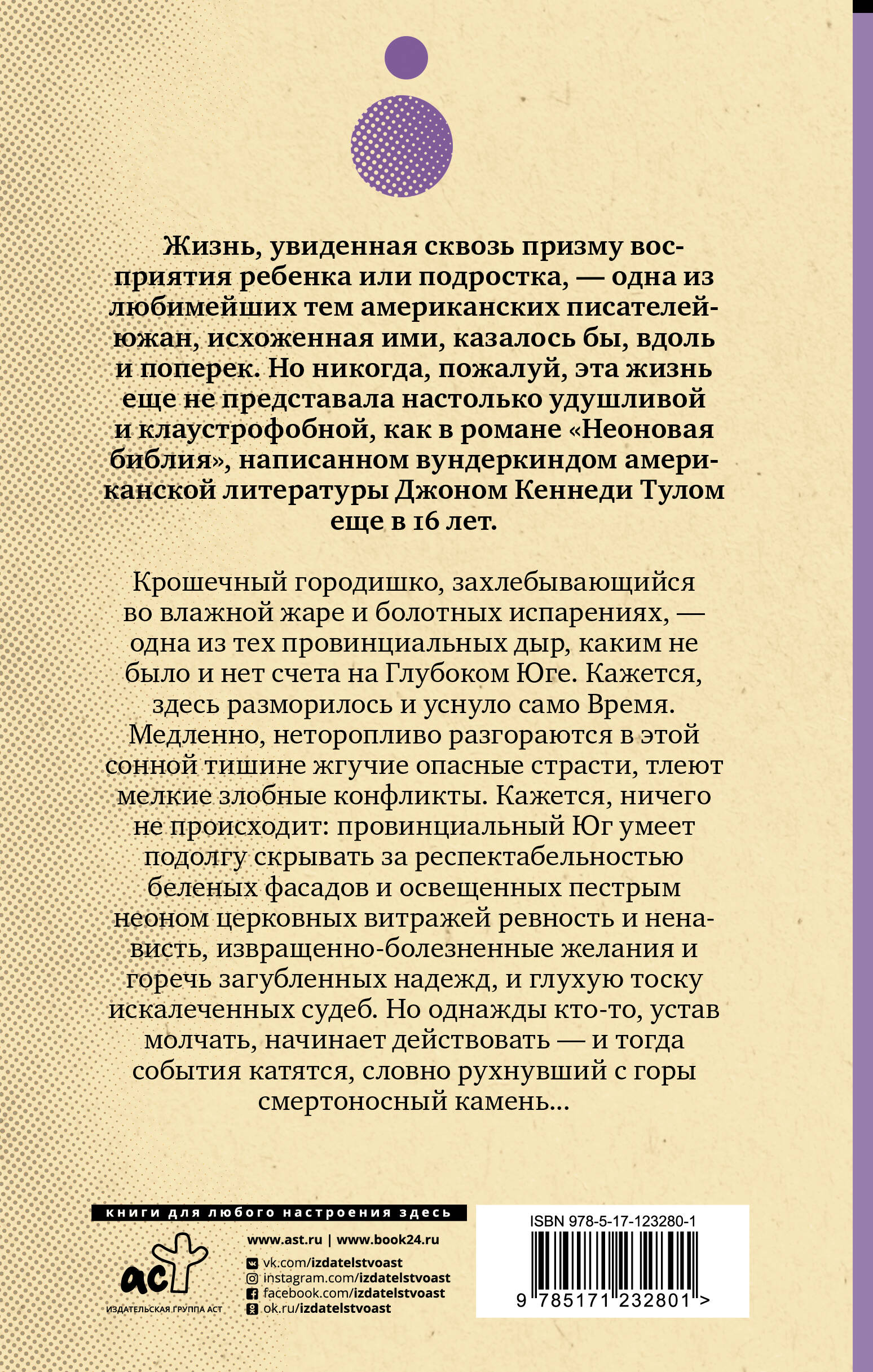 Жизнь, увиденная сквозь призму восприятия ребенка или подростка, - одна из любимейших тем американских писателей-южан, исхоженная ими, казалось бы, вдоль и поперек. Но никогда, пожалуй, эта жизнь еще не представала настолько удушливой и клаустрофобной, как в романе "Неоновая библия", написанном вундеркиндом американской литературы Джоном Кеннеди Тулом еще в 16 лет. Крошечный городишко, захлебывающийся во влажной жаре и болотных испарениях, - одна из тех провинциальных дыр, каким не было и нет счета на Глубоком Юге. Кажется, здесь разморилось и уснуло само Время. Медленно, неторопливо разгораются в этой сонной тишине жгучие опасные страсти, тлеют мелкие злобные конфликты. Кажется, ничего не происходит: провинциальный Юг умеет подолгу скрывать за респектабельностью беленых фасадов и освещенных пестрым неоном церковных витражей ревность и ненависть, извращенно-болезненные желания и горечь загубленных надежд, и глухую тоску искалеченных судеб. Но однажды кто-то, устав молчать, начинает действовать - и тогда события катятся, словно рухнувший с горы смертоносный камень...| Издательство | ИЗДАТЕЛЬСТВО "АСТ" |
