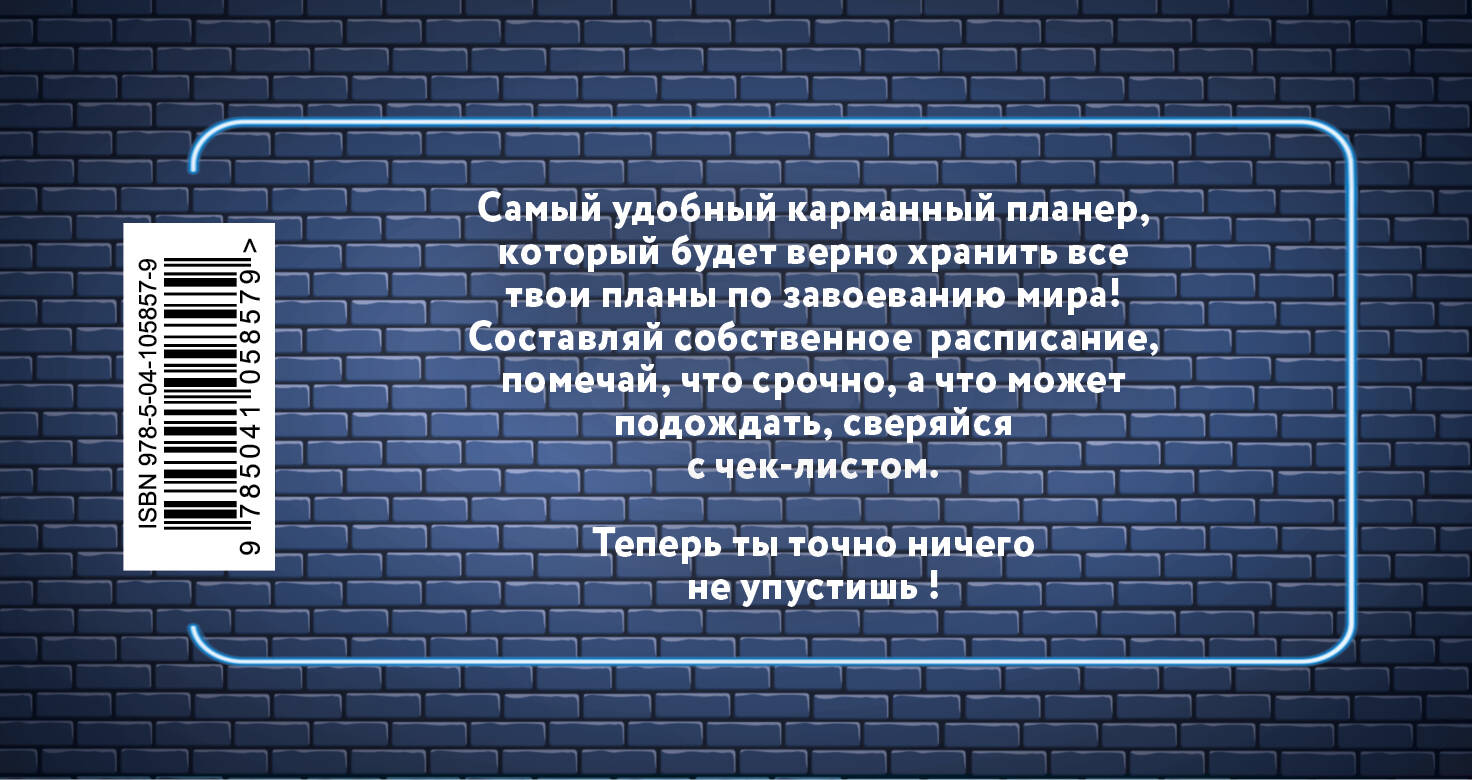 Как все успевать и ничего не забыть? Как организовать свои дела, планы и встречи, расставить все полочкам, чтобы достичь самых главных целей? Разработай свою стратегию жизни с помощью лимитированной коллекции стильных планеров! Составляй свое собственное расписание, помечай, что срочно, а что может подождать, что нужно обязательно запомнить, а о чем лучше вообще забыть. 96 страниц на пружине для записи всех предстоящих событий, места для комментариев, удобный формат позволяет всегда твоему планеру быть с тобой и не позволит упустить ничего важного из виду. Технические параметры: Размер: 80х160 мм Вид скрепления: мягкая обложка на пружине Обложка: Мел. Картон 250гр/м Отделка обложки: Пленка матовая, лак глянцевый Листаж: 96 стр. Внутренний блок: офсетная 80гр/м Линовка блока: таблица-расписание по неделям Выпускается в 3 оформлениях:| Издательство | Эксмо |