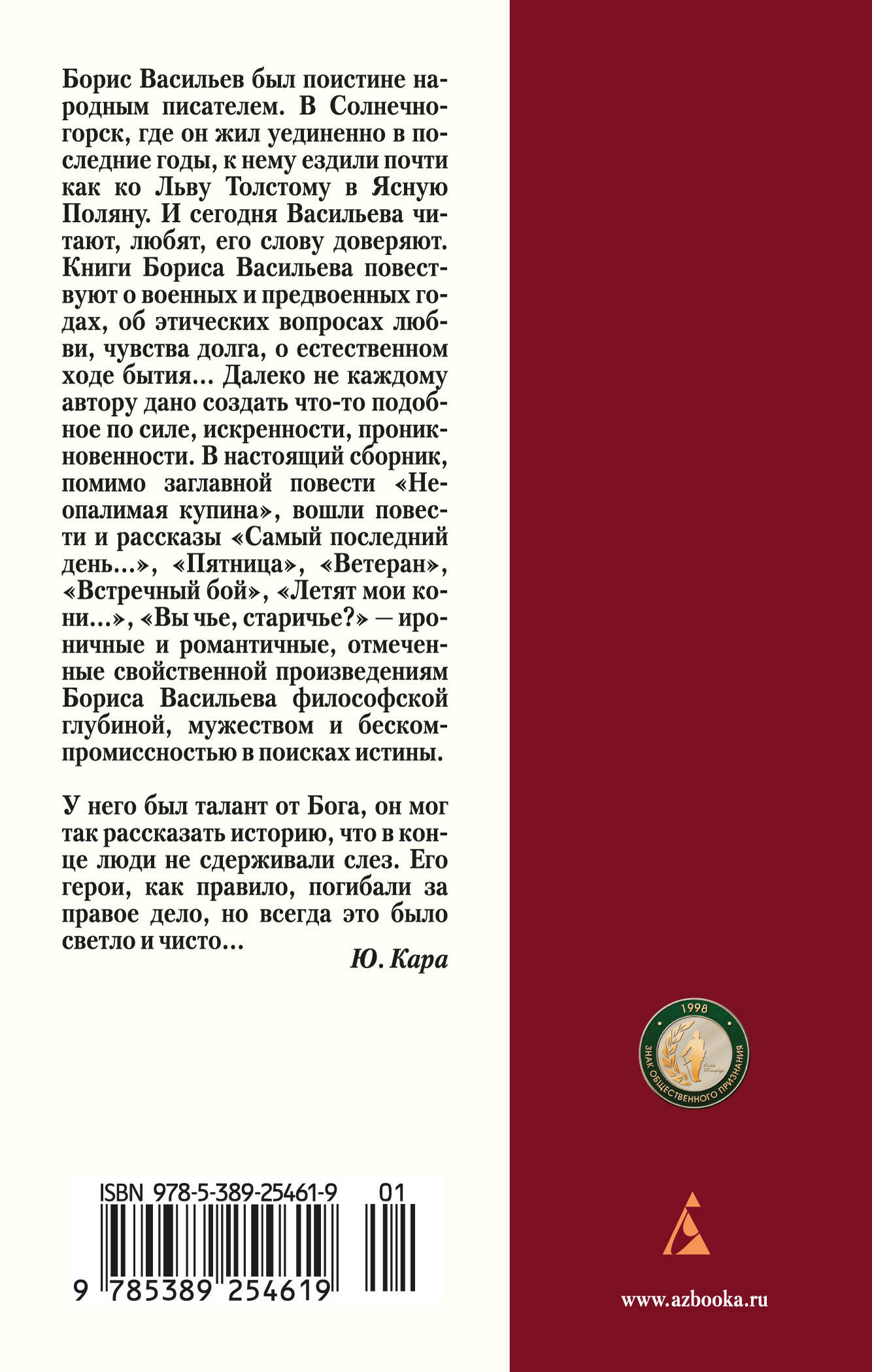 Борис Васильев был поистине народным писателем. В Солнечногорск, где он жил уединенно в последние годы, к нему ездили почти как ко Льву Толстому в Ясную Поляну. И сегодня Васильева читают, любят, его слову доверяют. Книги Бориса Васильева повествуют о военных и предвоенных годах, об этических вопросах любви, чувства долга, о естественном ходе бытия... Далеко не каждому автору дано создать что-то подобное по силе, искренности, проникновенности. В настоящий сборник, помимо заглавной повести "Неопалимая купина", вошли повести и рассказы "Самый последний день...", "Пятница", "Ветеран", "Встречный бой", "Летят мои кони...", "Вы чье, старичье?" - ироничные и романтичные, отмеченные свойственной произведениям Бориса Васильева философской глубиной, мужеством и бескомпромиссностью в поисках истины.| Издательство | Азбука-Аттикус Издат.группа ООО |