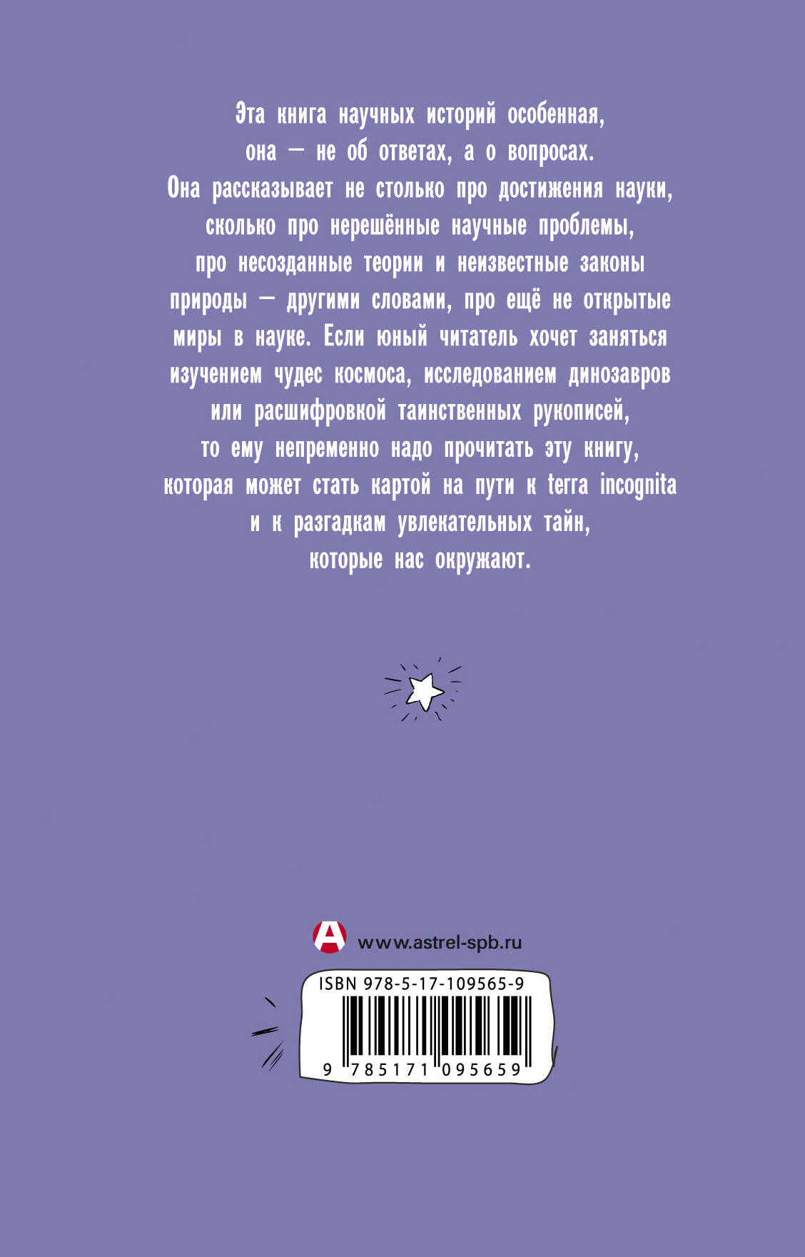 Эта книга научных историй особенная, она - не об ответах, а о вопросах. Она рассказывает не столько про достижения науки, сколько про нерешённые научные проблемы, про несозданные теории и неизвестные законы природы - другими словами, про ещё не открытые острова в науке. Если юный читатель хочет заняться изучением чудес космоса, исследованием динозавров или расшифровкой таинственных рукописей, то ему непременно надо прочитать эту книгу, которая может стать картой на пути к terra incognita и к разгадкам увлекательных тайн, которые нас окружают.| Издательство | ИЗДАТЕЛЬСТВО "АСТ" |