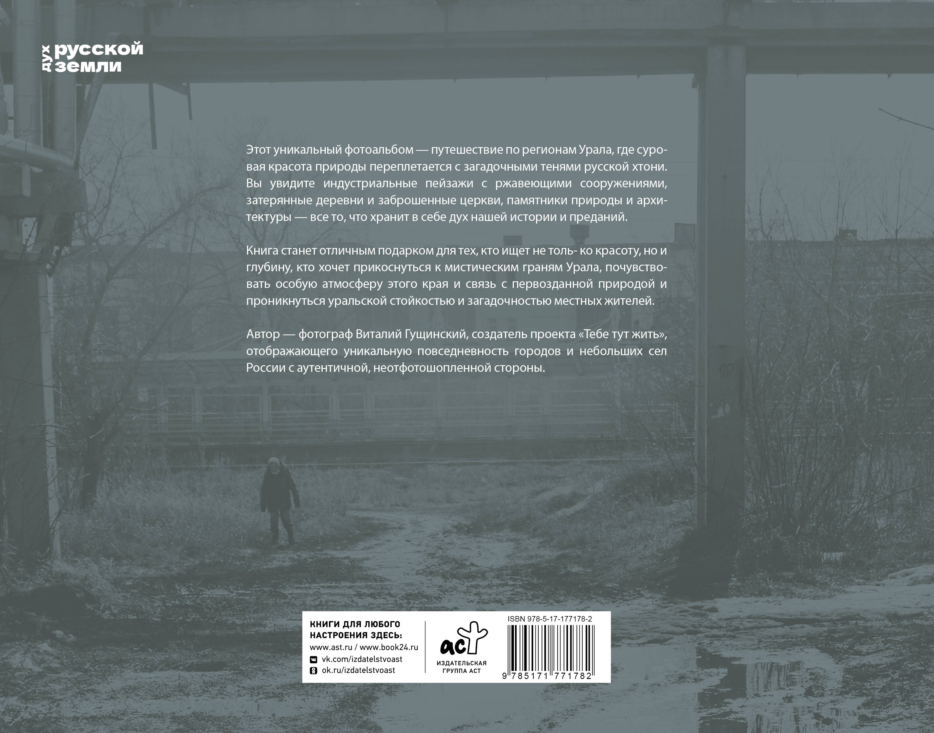 Этот уникальный фотоальбом - путешествие по регионам Урала, где суровая красота природы переплетается с загадочными тенями русской хтони. Вы увидите индустриальные пейзажи с ржавеющими сооружениями, затерянные деревни и заброшенные церкви, памятники природы и архитектуры - всё то, что хранит в себе дух нашей истории и преданий. Книга станет отличным подарком для тех, кто ищет не только красоту, но и глубину, кто хочет прикоснуться к мистическим граням Урала, почувствовать особую атмосферу этого края и связь с первозданной природой, и проникнуться уральской стойкостью и загадочностью местных жителей. Автор - фотограф Виталий Гущинский, создатель проекта "Тебе тут жить", отображающего уникальную повседневность городов и небольших сел России с аутентичной, неотфотошопленной стороны.| Издательство | Издательство "АСТ" |