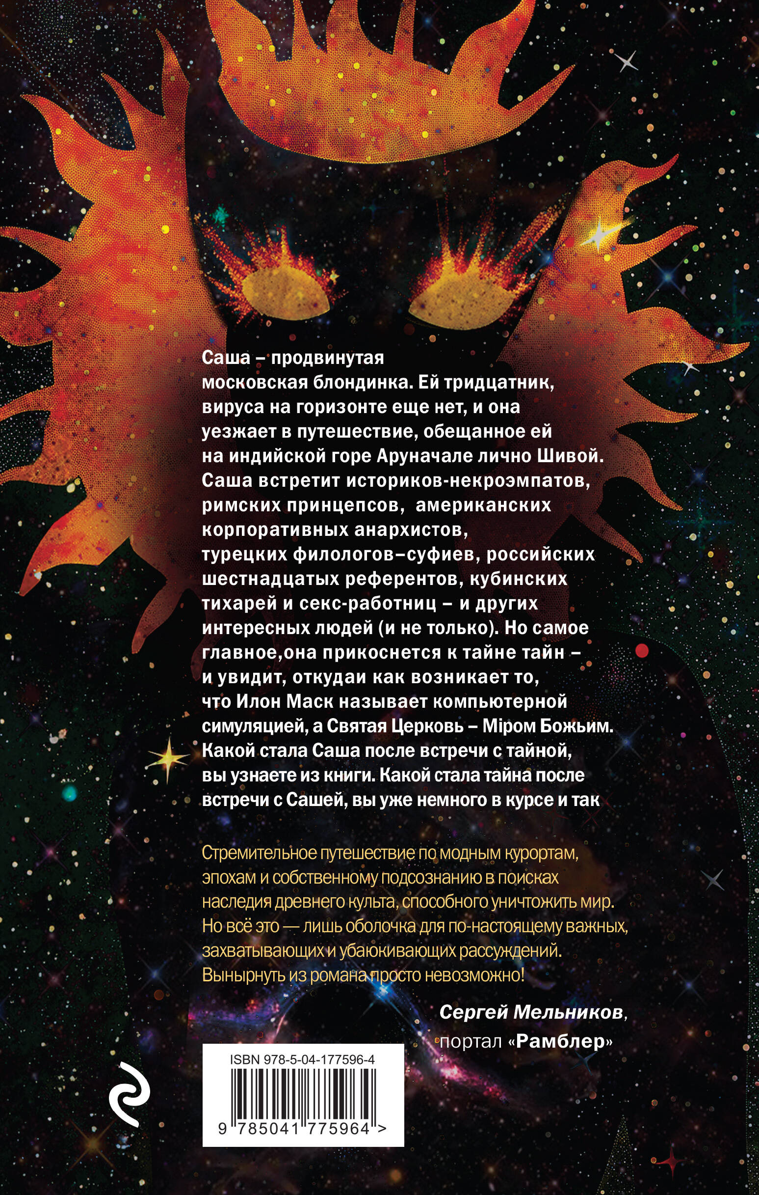 Саша - продвинутая московская блондинка. Ей тридцатник, вируса на горизонте еще нет, и она уезжает в путешествие, обещанное ей на индийской горе Аруначале лично Шивой. Саша встретит историков-некроэмпатов, римских принцепсов, американских корпоративных анархистов, турецких филологов-суфиев, российских шестнадцатых референтов, кубинских тихарей и секс-работниц - и других интересных людей (и не только). Но самое главное, она прикоснется к тайне тайн - и увидит, откуда и как возникает то, что Илон Маск называет компьютерной симуляцией, а Святая Церковь - Мiром Божьим. Какой стала Саша после встречи с тайной, вы узнаете из книги. Какой стала тайна после встречи с Сашей, вы уже немного в курсе и так.| Издательство | ООО "Издательство "Эксмо" |