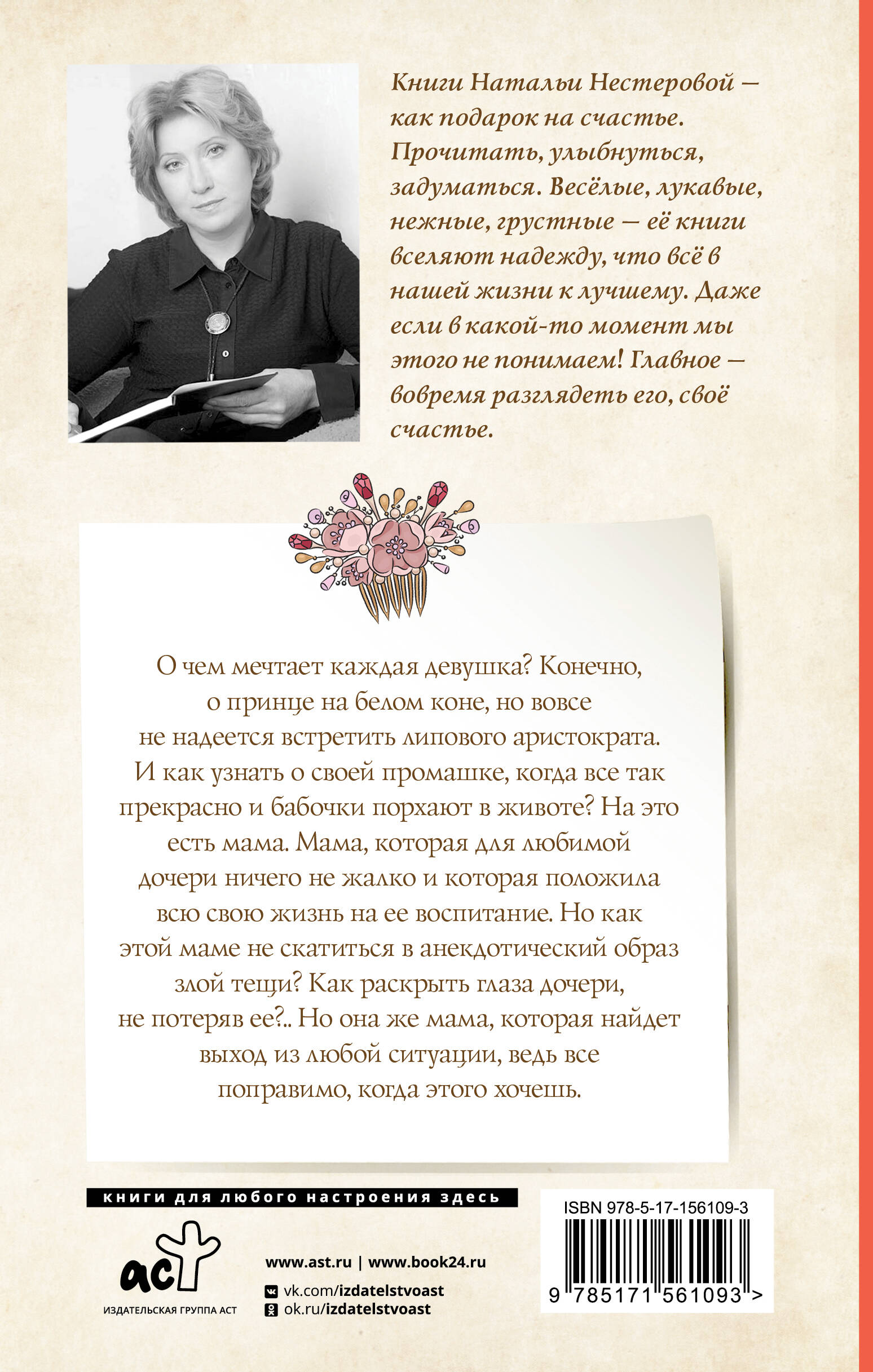 О чем мечтает каждая девушка? Конечно, о принце на белом коне, но вовсе не надеется встретить липового аристократа. И как узнать о своей промашке, когда все так прекрасно и бабочки порхают в животе? На это есть мама. Мама, которая для любимой дочери ничего не жалко и которая положила всю свою жизнь на ее воспитание. Но как этой маме не скатиться в анекдотический образ злой тещи? Как раскрыть глаза дочери, не потеряв ее?.. Но она же мама, которая найдет выход из любой ситуации, ведь все поправимо, когда этого хочешь.| Издательство | ИЗДАТЕЛЬСТВО "АСТ" |