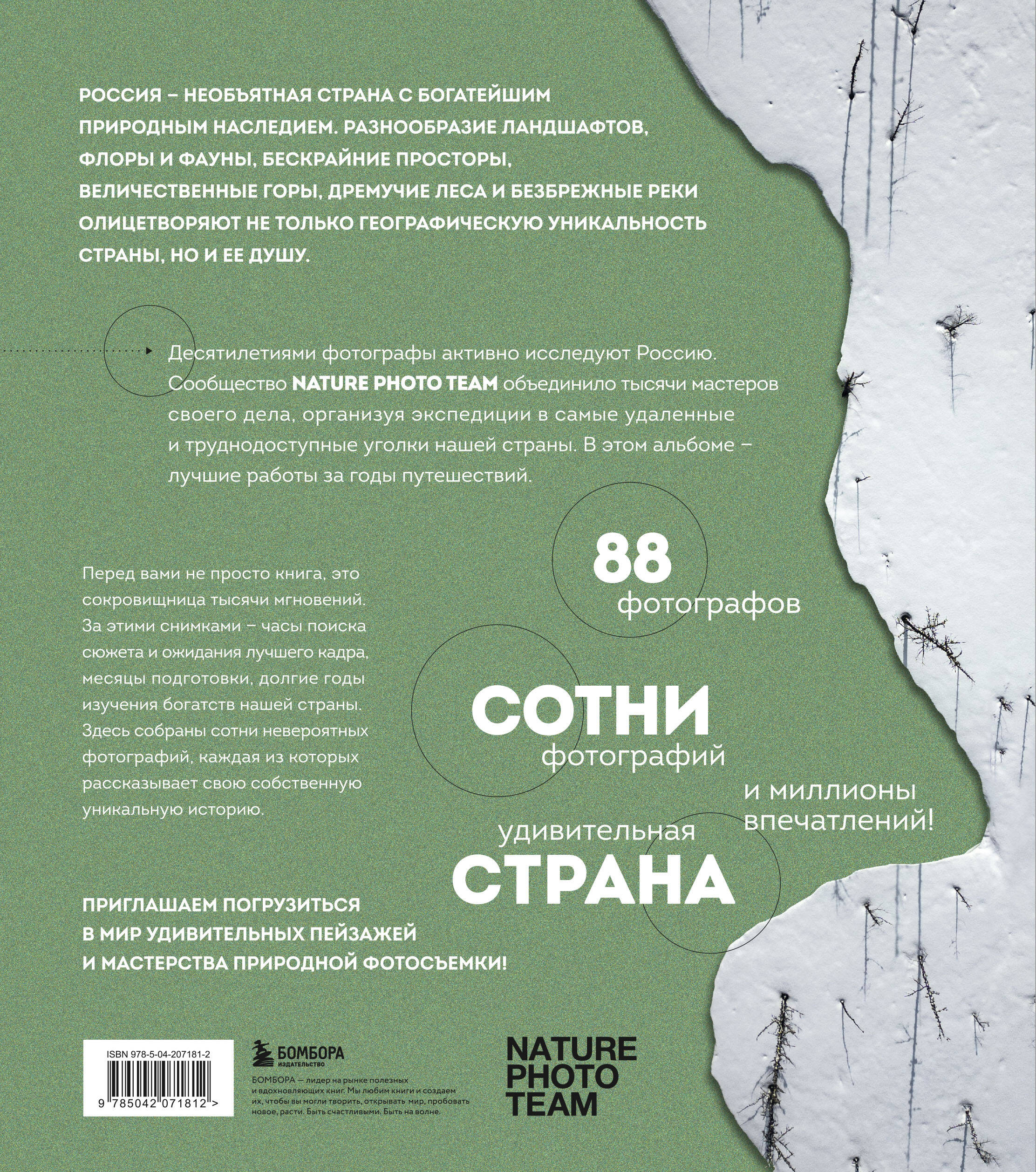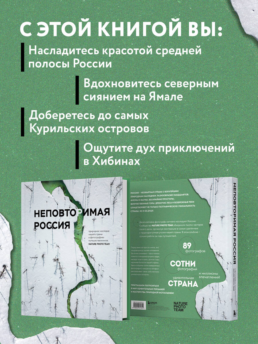 Откройте для себя Неповторимую Россию глазами природных фотографов Nature Photo Team! Nature Photo Team - сообщество любителей природы, путешествий и фотографии. Организуют форумы, фестивали и фотовыставки. Издают фотоальбомы и публикуют полезные статьи для всех любителей фотографии. Команда объединила десятки признанных экспертов, которые популяризируют путешествия и искусство фотосъемки. Природа нашей страны невероятно разнообразна: от живописных лесов Средней полосы до суровых просторов Ямала, от диких Курильских островов до загадочных Чарских песков. Каждый уголок России уникален и по-своему удивителен. В этом альбоме фотографы команды Nature Photo Team собрали бесценную мозаику снимков, чтобы показать, насколько контрастной может быть природа нашей страны, поделиться невероятными видами самых труднодоступных мест, а также обратить внимание читателя на необычные сюжеты, которые каждый может увидеть в своей повседневной жизни. • Средняя полоса России: познакомьтесь поближе с таинственной красотой лесов и их обитателей, поразитесь инопланетному многообразию подводного мира, взгляните на шедевры макросъемки и погрузитесь в чарующую атмосферу природы, которая веками вдохновляет художников и писателей. • Ямал: вдохновитесь невероятным северным сиянием, присмотритесь к очаровательным дарам сурового региона и проникнитесь глубокой таежной красотой. • Таганай: погрузитесь в сказочный мир Южного Урала, исследуйте суровые горные просторы и ощутите безмолвное величие заснеженных вершин. • Чарские пески: позвольте воображению перенести вас в другую вселенную, исследуйте контрасты природы, наблюдая за песками пустынных дюн и отражением ледяных рек. • Курильские острова: побывайте в самых труднодоступных местах нашей страны, познакомьтесь с самыми колоритными обитателями островов, узнайте все о дикой и экзотической природе Курил. • Колымский край: откройте для себя незабываемые дикие просторы с величественными горными реками, лиственничными деревьями и таинственной атмосферой. • Хибины: насладитесь красотой уникальных природных форм, ощутите дух приключений и навсегда влюбитесь в великолепные горные и лесные пейзажи. Этот альбом - способ преодолеть тысячи километров дорог и увидеть истинную Россию, во всем ее многообразии. Великолепные фотографии от профессионалов своего дела, выполненные на высококачественной бумаге, стильное оформление и крупный формат делают книгу настоящим произведением искусства и ценным подарком.| Издательство | ООО "Издательство "Эксмо" |
