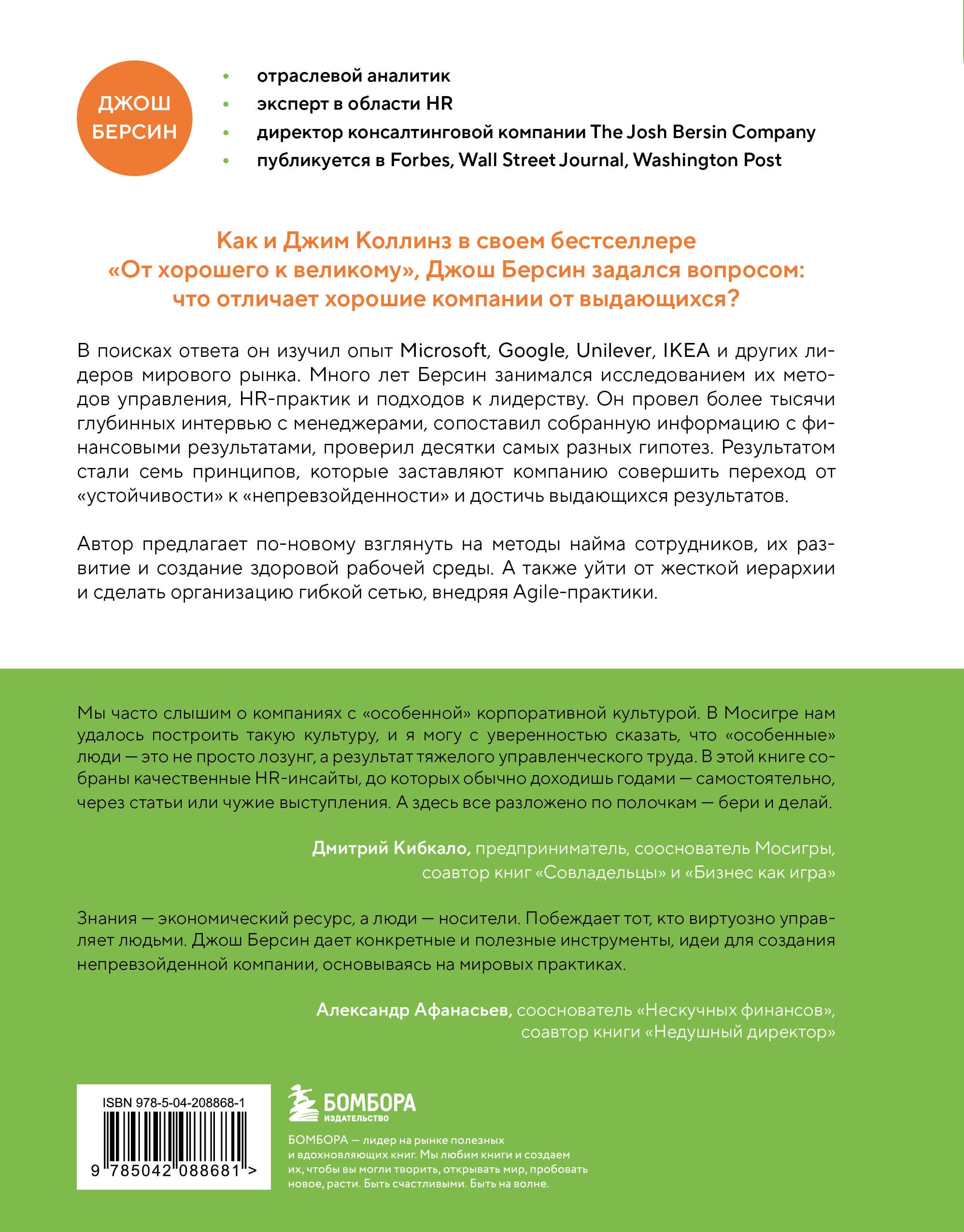 Как и Джим Коллинз в своем бестселлере «От хорошего к великому», Джош Берсин задался вопросом: что отличает хорошие компании от выдающихся? В поисках ответа он изучил опыт Microsoft, Google, Unilever, IKEA и других лидеров мирового рынка. Много лет Берсин занимался исследованием их методов управления, HR-практик и подходов к лидерству. Он провел более тысячи глубинных интервью с менеджерами, сопоставил собранную информацию с финансовыми результатами, проверил десятки самых разных гипотез. Результатом стали - семь принципов, которые заставляют компанию совершить переход от «устойчивости» к «непревзойденности» и достичь выдающихся результатов. Автор предлагает по-новому взглянуть на методы найма сотрудников, их развитие и создание здоровой рабочей среды. А также уйти от жесткой иерархии и сделать организацию гибкой сетью, внедряя Agile-практики.| Издательство | ООО "Издательство "Эксмо" |