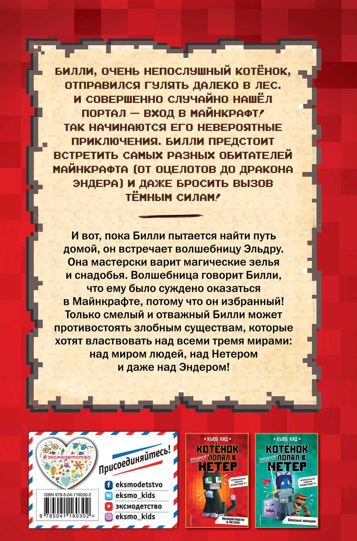 Специально для фанатов «Майнкрафт»! Спешите познакомиться с Билли, шустрым и непослушным котёнком, который ушёл гулять слишком далеко в лес и случайно обнаружил портал в «Майнкрафт»! Билли предстоит встретить самых разных обитателей Майнкрафта (от оцелотов до дракона Эндера) и даже бросить вызов тёмным силам! Ведь только он может противостоять злобным существам, которые хотят властвовать над всеми тремя мирами: над миром людей, над Нетером и даже над Эндером! Гасты, крестьяне, криперы, свинозомби, ифриты и кубы лавы - всё, что вы знаете и любите! На обложке нарисован классный котёнок. А внутри - плотная белая бумага, цветные иллюстрации и крупный шрифт.