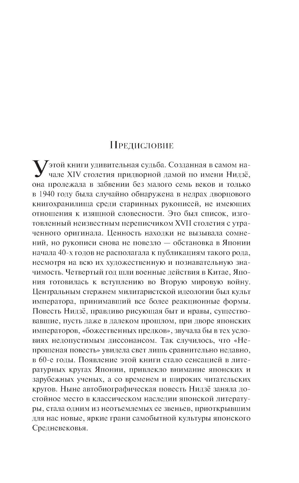 «Непрошеная повесть» создана в XIII веке легендарной фрейлиной Нидзё, наследницей некогда могущественной аристократической семьи, родственной императорскому дому Японии. На страницах своего дневника Нидзё предстает одаренной, наделенной природным умом и тонкой душой - она описывает свой путь от фаворитки императора до буддийской монахини в непростое время угасания японской монархии. Удивительная энергия, настойчивое и целеустремленное желание вырваться из порочного круга дворцовой жизни не дают Нидзё пасть духом.| Издательство | Эксмо |