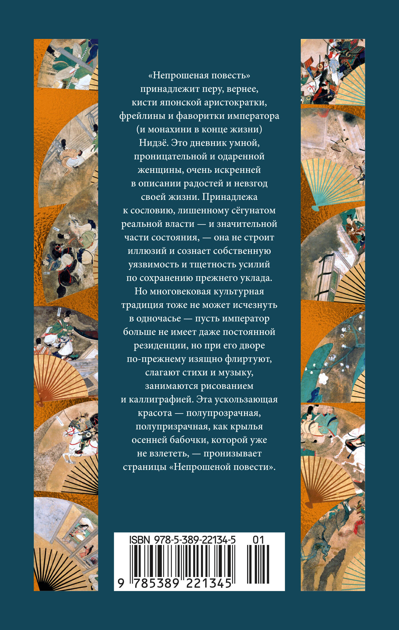 "Непрошеная повесть" создана в XIII веке наследницей некогда могущественной аристократической фамилии, родственной императорскому дому Японии, фрейлиной Нидзё. Это дневник умной, проницательной и одаренной женщины, которой выпало жить в эпоху, когда монархи Японии - и в целом аристократия - практически полностью лишились реальной власти, перешедшей к военачальникам-сёгунам. С властью ушла и значительная часть материальных богатств - земель и ценностей, конфискованных сёгунатом. Но многовековая культурная традиция не могла исчезнуть в одночасье: даже при лишенном резиденции императорском дворе по-прежнему слагали стихи и музыку, занимались рисованием и каллиграфией. Эта ускользающая красота - полупрозрачная, полупризрачная, как крылья осенней бабочки, которой уже не взлететь, - пронизывает страницы "Непрошеной повести".| Издательство | Азбука-Аттикус Издат.группа ООО |