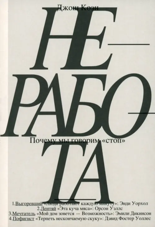 Книга британского психоаналитика Джоша Коэна посвящена нашим отношениям с трудом, точнее - заложенному в каждом из нас желанию не работать, которое отнюдь не безоблачно сосуществует с желанием работать - и добиваться успеха, престижа, благополучия, - причем, как полагает автор, является не менее, а возможно, и более важным, даже определяющим для человека. Это желание знакомо нам с детства, когда оно с легкостью удовлетворяется, но мы учимся подавлять его и привыкаем отдавать все силы работе, порой забывая, что жизнь ею не исчерпывается. Иногда результатом становятся большие достижения в избранной нами профессии, иногда - депрессия, иногда то и другое вместе. Как быть с потребностью в «неработе», которую невозможно реализовать в полной мере, но и отрицать, задавливать в себе, крайне опасно? Автор ищет подступы к ответу на этот, должно быть, неразрешимый вопрос в собственном жизненном опыте, в историях своих пациентов и в судьбах нескольких выдающихся людей, столкнувшихся с конфликтом между работой и «неработой» вплотную, - Эмили Дикинсон, Орсона Уэллса, Энди Уорхола и Дэвида Фостера Уоллеса. Из автобиографических очерков, заметок психоаналитика и тонких наблюдений о природе творчества складывается этот текст, продиктованный стремлением Джоша Коэна разобраться в себе и способный помочь в этом нам.