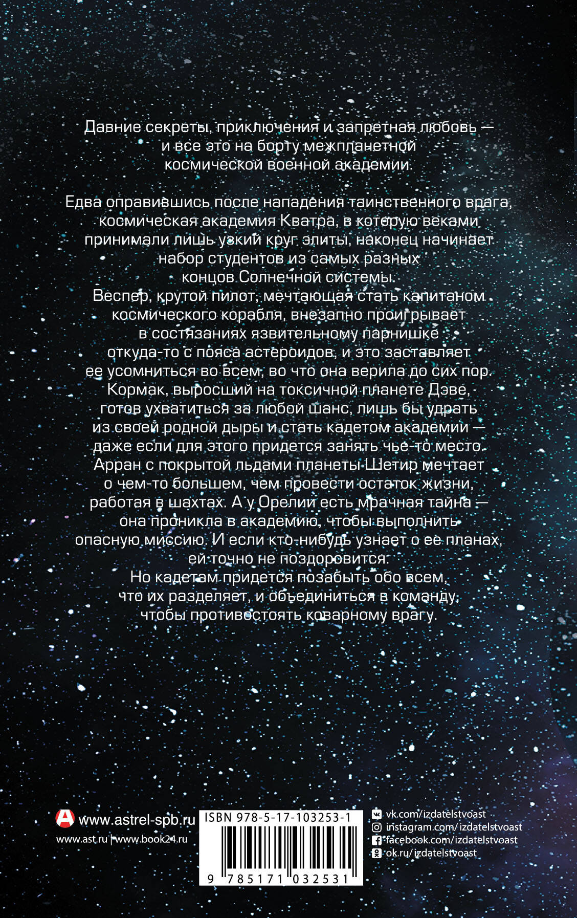 Давние секреты, приключения и запретная любовь - и всё это на борту межпланетной космической военной академии. Едва оправившись после нападения таинственного врага, космическая академия Кватра, в которую веками принимали лишь узкий круг элиты, наконец начинает набор студентов из самых разных концов Солнечной системы. Веспер, крутой пилот, мечтающая стать капитаном космического корабля, внезапно проигрывает в состязаниях язвительному парнишке откуда-то с пояса астероидов, и это заставляет ее усомниться во всем, во что она верила до сих пор. Кормак, выросший на токсичной планете Дэве, готов ухватиться за любой шанс, лишь бы удрать из своей родной дыры и стать кадетом академии - даже если для этого придется занять чье-то место. Арран с покрытой льдами планеты Шетир мечтает о чем-то большем, чем провести остаток жизни, работая в шахтах. А у Орелии есть мрачная тайна - она проникла в академию, чтобы выполнить опасную миссию. И если кто-нибудь узнает о ее планах, ей точно не поздоровится. Но кадетам придётся позабыть обо всём, что их разделяет, и объединиться в команду, чтобы противостоять коварному врагу.| Издательство | ИЗДАТЕЛЬСТВО "АСТ" |