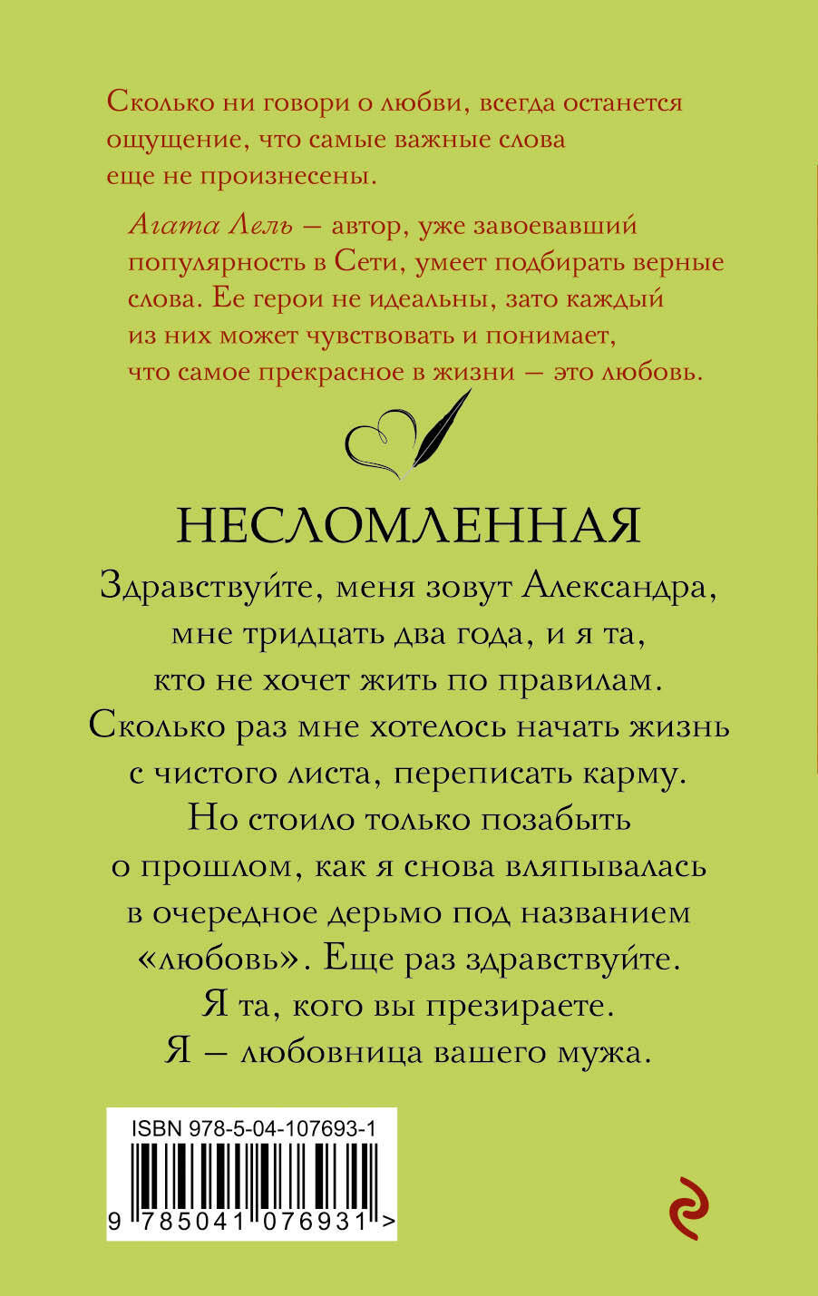 Здравствуйте, меня зовут Александра, мне тридцать два года, и я та, кто не хочет жить по правилам. Сколько раз мне хотелось начать жизнь с чистого листа, переписать карму. Но стоило только позабыть о прошлом, как я снова вляпывалась в очередное дерьмо под названием любовь. Еще раз здравствуйте. Я та, кого вы презираете. Я - любовница вашего мужа.| Издательство | ООО "Издательство "Эксмо" |