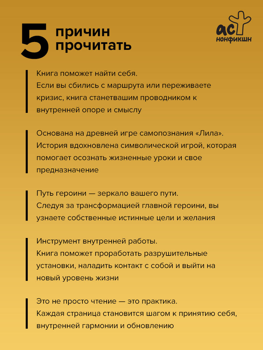 Эта книга для тех, кто сбился с маршрута, нуждается в опоре, а иногда и в трамплине, для того чтобы наладить свою жизнь. Перед вами - тонкий инструмент, который поможет вам вернуться к себе и найти выход из душевного кризиса. Эта история, написанная по мотивам популярной игры "Лила", даст возможность наладить связь с собой и осознать ваше истинное предназначение. В моменты неопределенности и сомнений эта книга станет вашим ориентиром, подсказывающим верное направление. Пройдя путь трансформаций вместе с главной героиней, вы узнаете свои истинные цели и желания и поймете, как достичь их. Вы не только проработаете разрушительные установки, мешающие вашему развитию, но и научитесь принимать себя настоящую и обретете внутреннюю гармонию. С помощью этой книги вы сможете: • принять и развить все грани вашей личности; • наладить связь с собой; • проработать внутренние кризисы и конфликты; • выйти на новый уровень жизни. Книга в твердой обложке.| Издательство | Издательство "АСТ" |