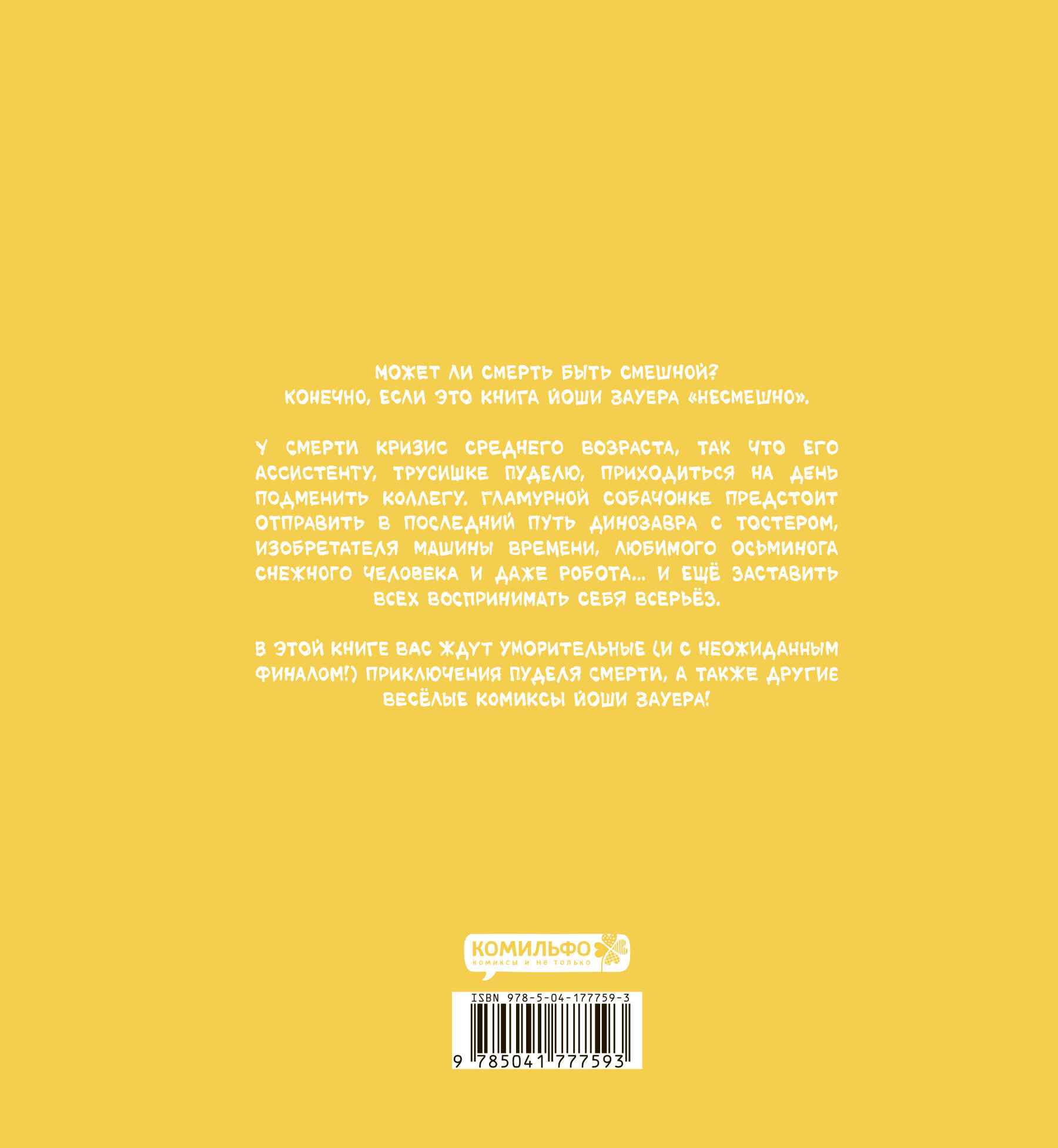 Может ли смерть быть смешной? Конечно, если это книга Йоши Зауера «Несмешно». У Смерти кризис среднего возраста, так что его ассистенту, трусишке Пуделю, приходиться на день подменить коллегу. Гламурной собачонке предстоит отправить в последний путь динозавра с тостером, изобретателя машины времени, любимого осьминога снежного человека и даже робота... и ещё заставить всех воспринимать себя всерьёз. В этой книге вас ждут уморительные (и с неожиданным финалом!) приключения Пуделя Смерти, а также другие весёлые комиксы Йоши Зауера!| Издательство | ООО "Издательство "Эксмо" |