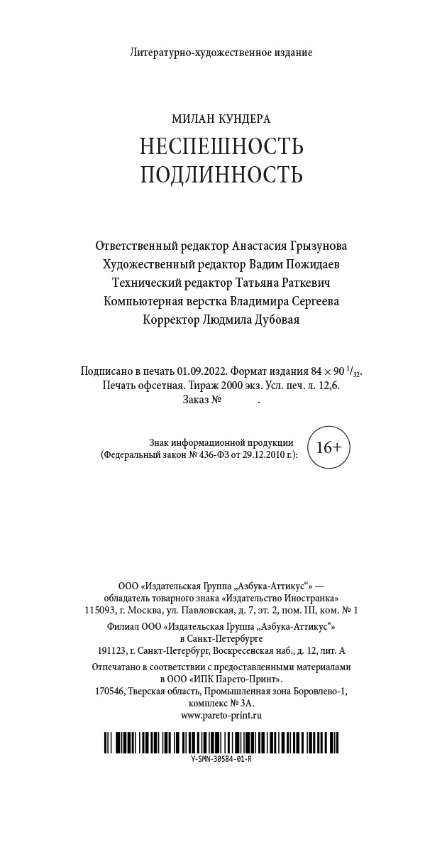 Милан Кундера - один из самых популярных писателей современности; все его произведения - неувядающие бестселлеры интеллектуальной прозы. «Неспешность» и «Подлинность» - два романа Кундеры второй половины 1990-х, написанные по-французски, две неспешные прихотливые истории о времени и темпе жизни, о любви, доверии, самообмане и старении.| Издательство | Иностранка |
