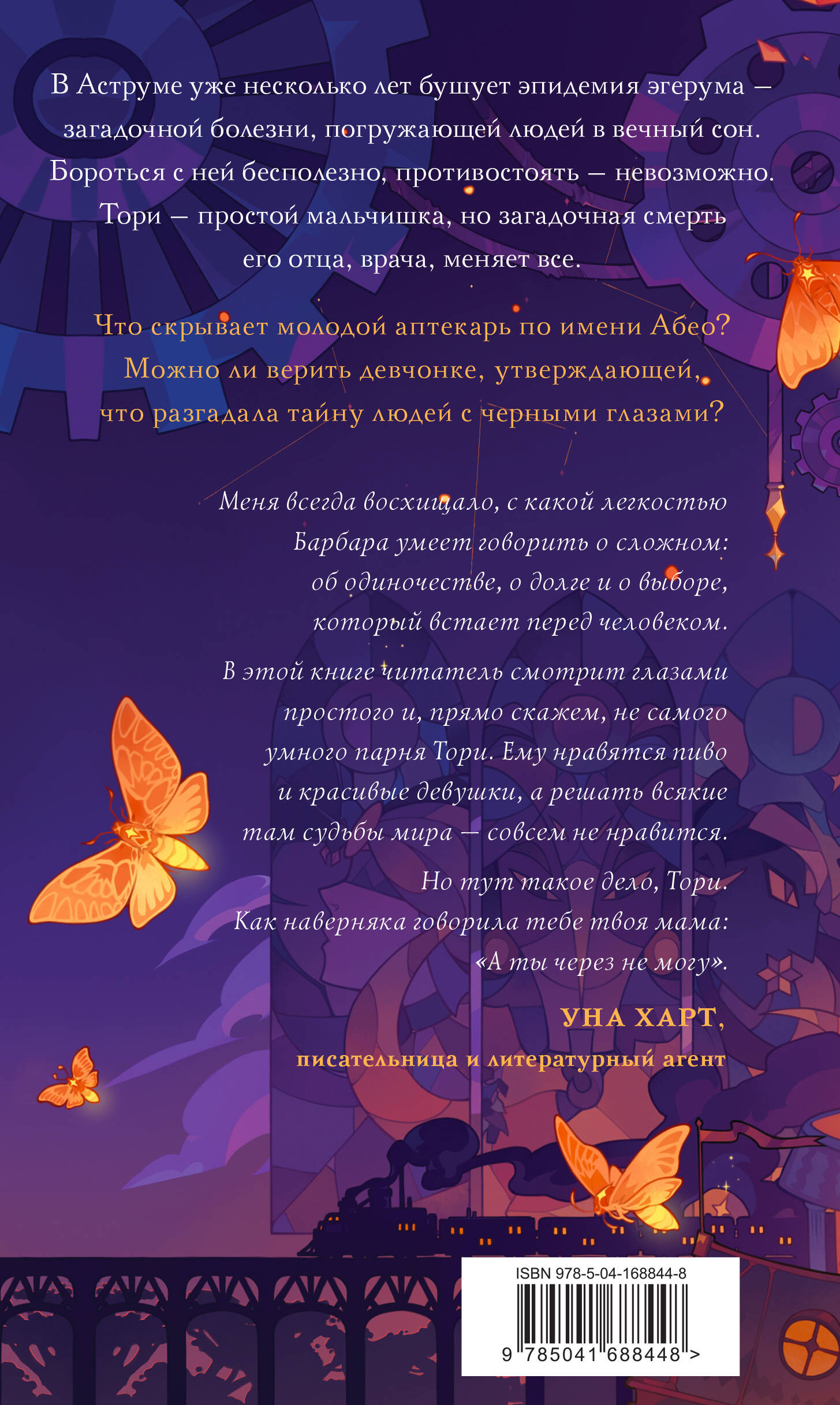 В Аструме уже несколько лет бушует эпидемия эгерума - загадочной болезни, погружающей людей в вечный сон. Бороться с ней бесполезно, противостоять - невозможно, хотя врачи не оставляют попыток. Тори - простой мальчишка, который любит хорошее пиво, шумные кабаки и красивых девушек. Но загадочная смерть его отца, врача, меняет все. Что скрывает молодой аптекарь по имени Абео? Можно ли верить девчонке, утверждающей, что разгадала тайну людей с черными глазами? Новый роман-однотомник Барбары Морриган, автора книг «Чудовище и чудовища» и «Сердце, что растопит океан». Издание дополнено яркими авторскими иллюстрациями на мелованной бумаге, а также цветными форзацами с картой и календарем мира. Главные герои - простые люди, оказавшиеся в непростой ситуации, со своими привычками и тревогами. Любовная линия slowburn, яркая ненависть, перерастающая в искреннюю любовь. Роман «Неспящие» поднимает актуальные социальные и моральные вопросы, трогающие каждого. Читатель проследит путь становления трех героев - от опасливых подростков до тех, кто вершит судьбы государства.| Издательство | ООО "Издательство "Эксмо" |