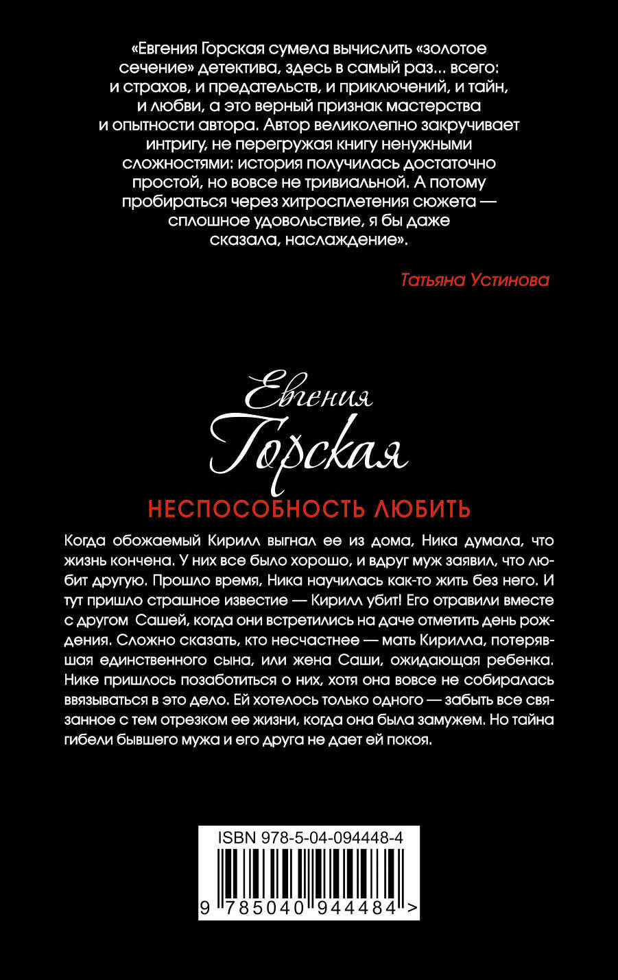 Когда обожаемый Кирилл выгнал ее из дома, Ника думала, что жизнь кончена. У них все было хорошо, и вдруг муж заявил, что любит другую. Прошло время, Ника научилась как-то жить без него. И тут пришло страшное известие - Кирилл убит! Его отравили вместе с другом Сашей, когда они встретились на даче отметить день рождения. Сложно сказать, кто несчастнее - мать Кирилла, потерявшая единственного сына, или жена Саши, ожидающая ребенка. Нике пришлось позаботиться о них, хотя она вовсе не собиралась ввязываться в это дело. Ей хотелось только одного - забыть все связанное с тем отрезком ее жизни, когда она была замужем. Но тайна гибели бывшего мужа и его друга не дает ей покоя. Татьяна Устинова рекомендует: «Удивительно, но в книгах Евгении Горской угадывается настроение больших русских романов. Она умещает в детектив современную энциклопедию разнообразнейших губительных страстей, созидательных любовей и ярких, живых, разноголосых героев. Получается не только интересно и зажигательно, но еще и очень по-настоящему - ровно настолько, чтобы захотелось поверить в эту историю. Горская ловко и умеючи держит читателя в напряжении: тебе иногда страшно, иногда смешно, иногда будто бы совсем безнадежно, но в конечном итоге понимаешь: всё будет хорошо!»| Издательство | ООО "Издательство "Эксмо" |