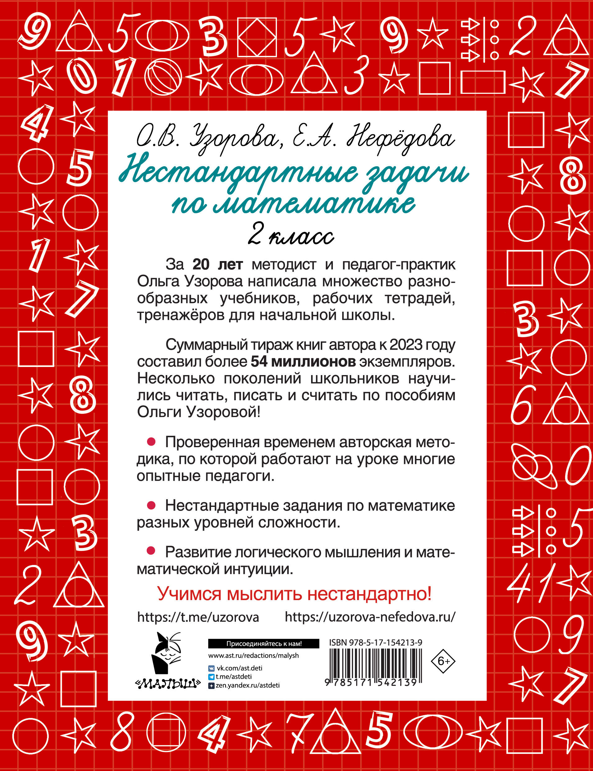 Ольга Васильевна Узорова - известный педагог-практик, автор более 6 000 книг для дошкольников и учеников младших классов. По результатам 2022 года О. В. Узорова признана одним из наиболее востребованных в России авторов учебных пособий. Сборник «Нестандартные задачи по математике. 2 класс» - это тренажёр, развивающий логическое мышление и формирующий математическую интуицию. Пособие содержит разнообразные интересные задания и множество иллюстраций. В игровой форме школьник более эффективно усваивает учебный материал по математике. Пусть ребёнок учится легко!| Издательство | Издательство "АСТ" |