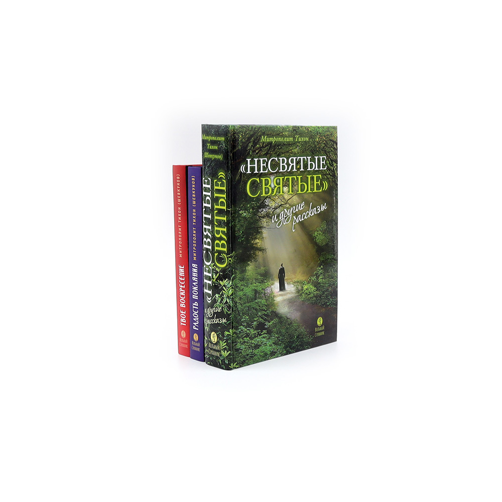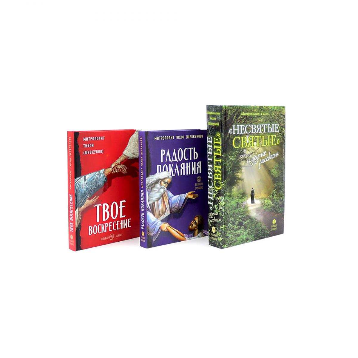 Комплект содержит книги. «Несвятые святые и другие рассказы» Один подвижник как-то сказал, что всякий православный христианин может поведать свое Евангелие, свою Радостную Весть о встрече с Богом. Конечно, никто не сравнивает такие свидетельства с книгами апостолов, своими глазами видевших Сына Божия, жившего на земле. И всё же мы, хоть и немощные, грешные, но Его ученики, и нет на свете ничего более прекрасного, чем созерцание поразительных действий Промысла Спасителя о нашем мире. «Радость покаяния» Пост - время свободы и радости духовной, время освобождения от греховных привычек - всего того лишнего, бесполезного, чуждого человеческой душе, но так прочно укоренившегося в ней. Церковь каждый год заботливо подводит нас к времени Великого поста и так же бережно ведет нас день за днем в течение этого спасительного времени: от греха - к покаянию, от духовной смерти - к воскресению души. В основе этой книги - проповеди и выступления митрополита Псковского и Порховского Тихона (Шевкунова). В них читатель найдет важные мысли о смысле человеческой жизни, о том, чего Бог ожидает от каждого из нас, о Промысле Божием, о подготовке и должном проведении великопостного времени, о покаянии и хранении себя от греха, о молитве. И о смирении, без которого все, даже самые суровые, подвиги не принесут пользы душе, без которого не сможет быть достигнута главная цель жизни христианина - единение с Богом. «Твое Воскресение» Новая книга митрополита Тихона (Шевкунова) посвящена величайшему событию, перевернувшему всю историю человечества, - Воскресению Христову. Вместе с автором и всей Церковью читатель сможет пройти путь от Светлого Христова Воскресения до дня Святой Троицы и отследить, как распространялась по Земле эта величайшая радость: от Сионской горницы до сердца каждого из нас. Речь пойдет и о вере апостола Фомы, и о смиренной любви Жен Мироносиц, об исцелении расслабленных наших душ, о простоте самарянки, которая всем сердцем искала Бога и обрела источник вечной жизни, о мужестве и мудрости слепорожденного. Вместе переживем и Вознесение Господне, отпразднуем день рождения Церкви - праздник Святой Троицы, вспомним схождение на апостолов Святого Духа Божия. Основанные на многовековом опыте Церкви и святых отцов объяснения владыки Тихона - лаконичные и живые, актуальные и современные. Размышления о столь важных понятиях христианской жизни интересны не только в пасхальный период, но полезны для чтения каждый день.| Издательство | Вольный Странник |