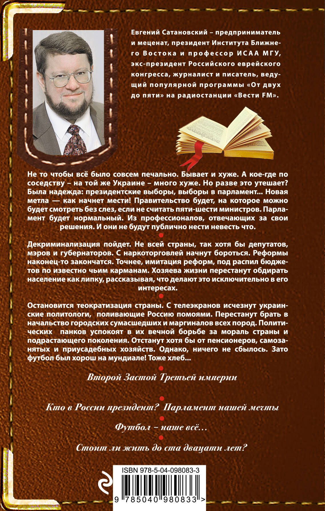 Евгений Сатановский - предприниматель и меценат, президент Института Ближнего Востока и профессор ИСАА МГУ, экс-президент Российского еврейского конгресса, журналист и писатель, ведущий популярной программы "От двух до пяти" на радиостанции "Вести ФМ". Второй Застой Третьей империи Кто в России президент? Парламент нашей мечты Футбол - наше всё... Стоит ли жить до ста двадцати лет? Не то чтобы всё было совсем печально. Бывает и хуже. А кое-где по соседству - на той же Украине - много хуже. Но разве это утешает? Была надежда: президентские выборы, выборы в парламент... Новая метла - как начнёт мести! Правительство будет, на которое можно смотреть без слёз, если не считать пяти-шести министров. Парламент будет нормальный. Из профессионалов, отвечающих за свои решения. И они не будут публично нести невесть что. Декриминализация пойдёт. Не всей страны, так хотя бы депутатов, мэров и губернаторов. С наркоторговлей начнут бороться. Реформы наконец-то закончатся. Точнее, имитация реформ, под распил бюджетов по известно чьим карманам. Хозяева жизни перестанут обдирать население как липку, рассказывая, что делают это исключительно в его интересах. Остановится теократизация страны. С телеэкранов исчезнут украинские политологи, поливающие Россию помоями. Перестанут брать в начальство городских сумасшедших и маргиналов всех пород. Политических панков успокоят в их вечной борьбе за мораль страны и подрастающего поколения. Отстанут хотя бы от пенсионеров, самозанятых и приусадебных хозяйств. Однако ничего не сбылось. Зато футбол был хорош на Мундиале! Тоже хлеб...| Издательство | ООО "Издательство "Эксмо" |