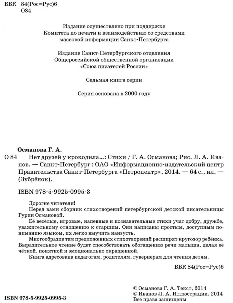 Дорогие читатели!<br /> Перед вами сборник стихотворений петербургской детской писательницы Гурии Османовой.<br /> Её весёлые, игровые, напевные и познавательные стихи учат добру, дружбе, уважительному отношению к старшим. Они написаны простым, доступным пониманию языком, их легко выучить наизусть.<br /> Многообразие тем предложенных стихотворений расширят кругозор ребёнка. Выразительное чтение будет способствовать обогащению речи малыша, делая её чёткой, понятной и эмоционально окрашенной.<br /> Книга адресована педагогам, родителям, гувернерам для чтения детям.
