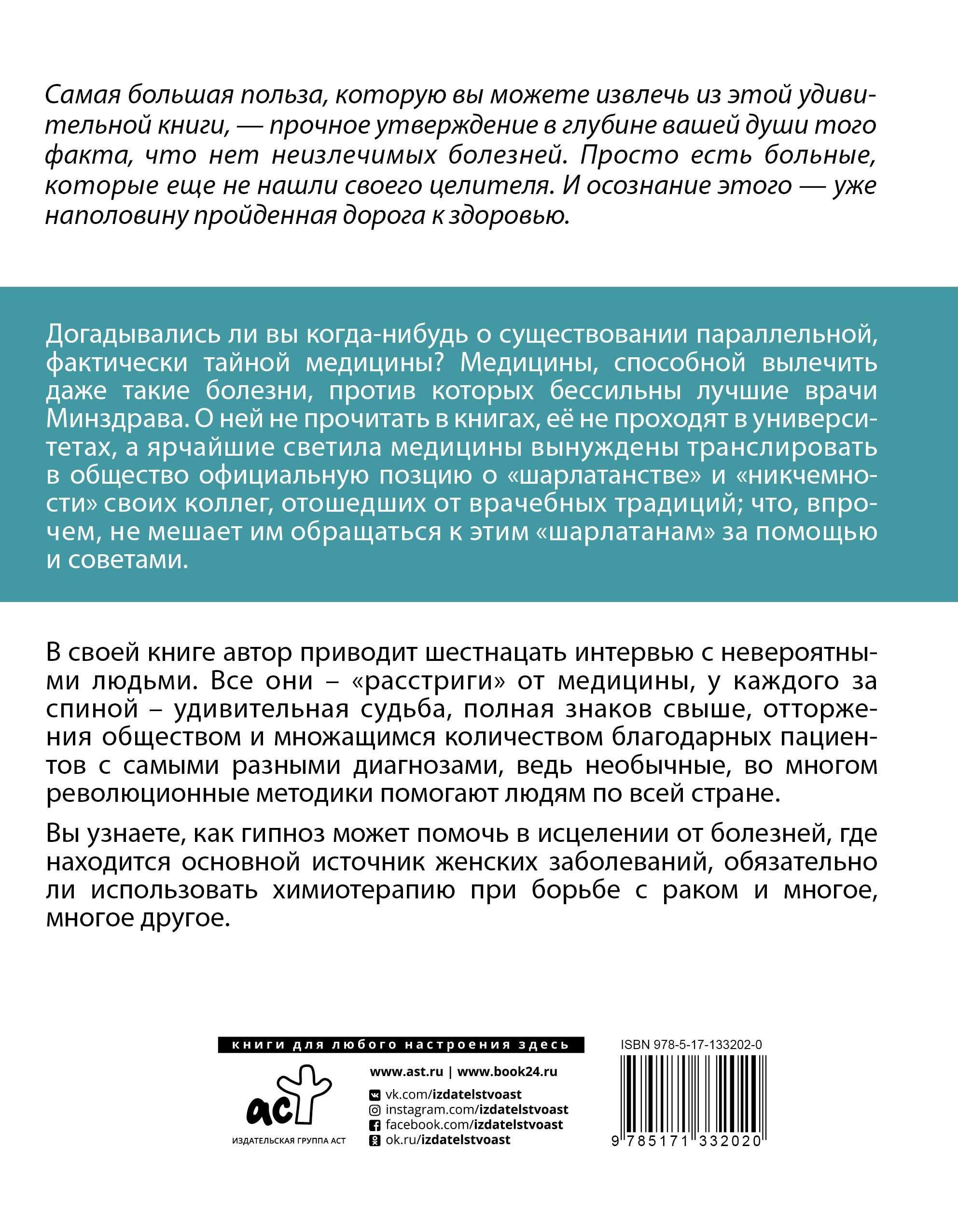 Вам говорят, что есть болезни, которые невозможно вылечить? Вам нагло врут! И книга Александра Никонова обязательно докажет это, ведь автор смог отыскать удивительных людей. Эти люди не работают в поликлиниках и больницах, но многочисленные благодарные пациенты стали лучшей рекомендацией и рекламой. Что можно противопоставить таблеткам? Как избавиться от проблем со здоровьем по женской части? Ответы на эти и многие другие вопросы вы найдете в новой книге Александра Никонова «Нет неизлечимых болезней. Научный подход к ненаучной медицине». Александр Никонов - журналист, публицист, популяризатор науки. Имеет многолетний опыт в своей работе и является лауреатом нескольких литературных премий, а его книги любимы и популярны, что является лучшей рекомендацией для прочтения.| Издательство | Издательство "АСТ" |