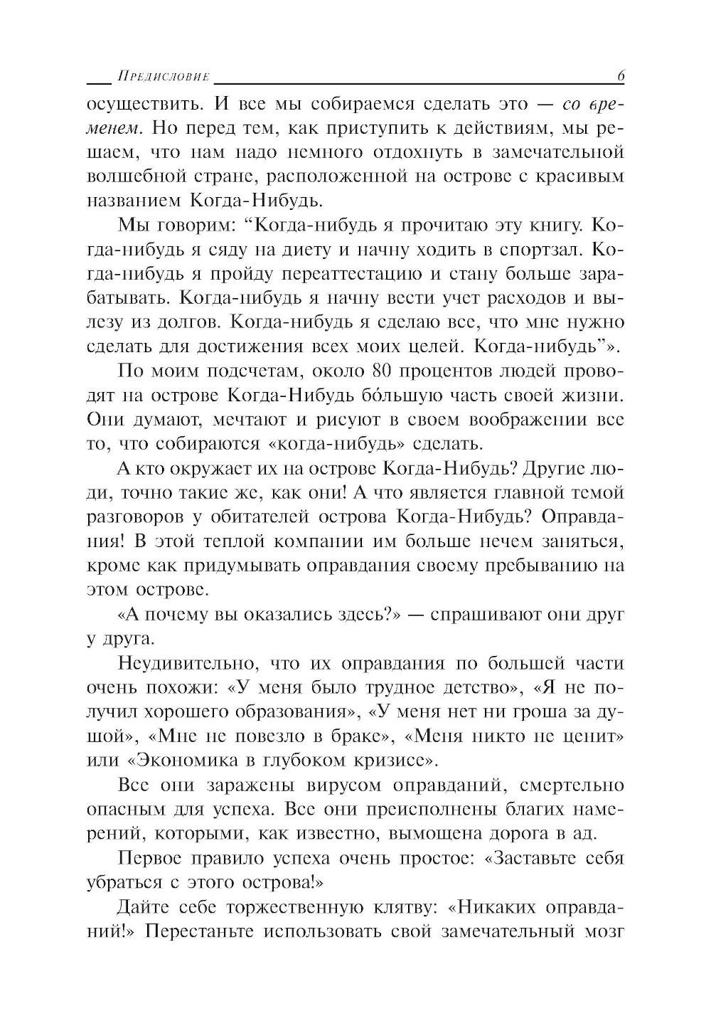 Почему одни люди успешнее других? Почему кому-то удается заработать больше денег, испытать больше счастья и достичь гораздо больших высот, чем подавляющему большинству остальных? В чем разница между ними и серой массой? Брайан Трейси считает причиной всех неудач всем нам знакомые оправдания. Неудачники оправдываются, а победители двигаются вперед. Дайте себе торжественную клятву: «Никаких оправданий!» Перестаньте использовать ваш замечательный мозг для придумывания рациональных обоснований и причин бездействия. Возьмитесь за дело! Эта книга написана для людей, которые охвачены страстным желанием больше делать, больше получать и достигать больших высот, чем когда-либо раньше, и послужит вам простым пошаговым руководством по превращению в выдающегося человека, способного на великие достижения.| Издательство | Попурри |