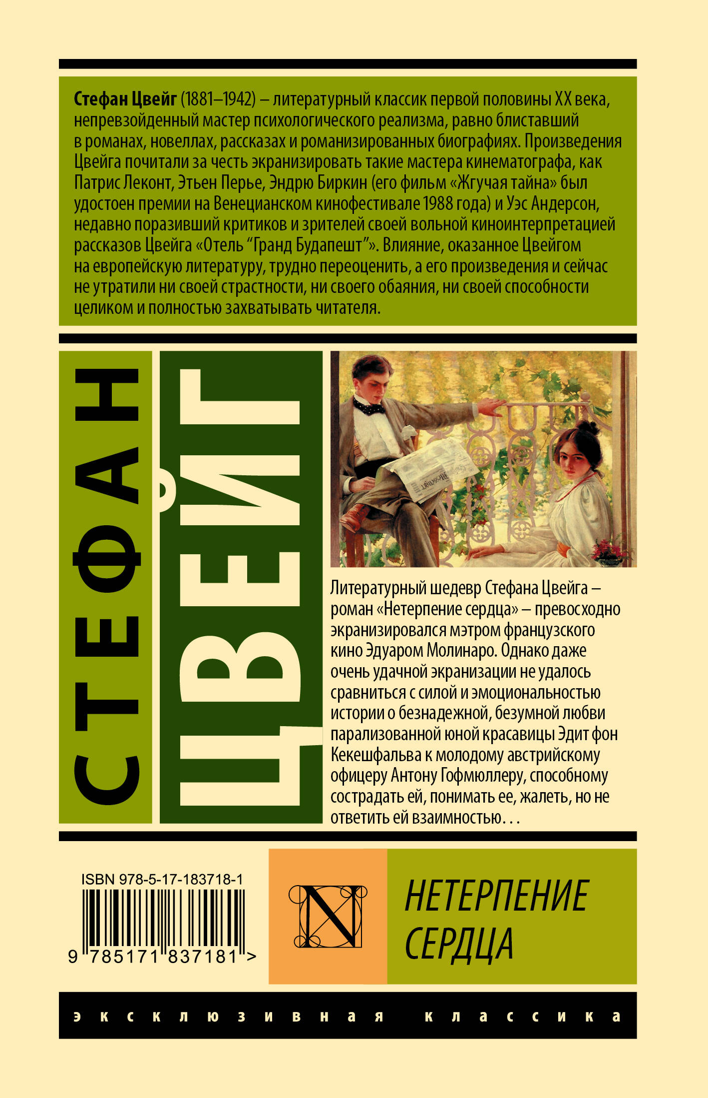 Литературный шедевр Стефана Цвейга - роман "Нетерпение сердца" - превосходно экранизировался мэтром французского кино Эдуаром Молинаро. Однако даже очень удачной экранизации не удалось сравниться с силой и эмоциональностью истории о безнадежной, безумной любви парализованной юной красавицы Эдит фон Кекешфальва к молодому австрийскому офицеру Антону Гофмюллеру, способному сострадать ей, понимать ее, жалеть, но не ответить ей взаимностью…| Издательство | Издательство "АСТ" |