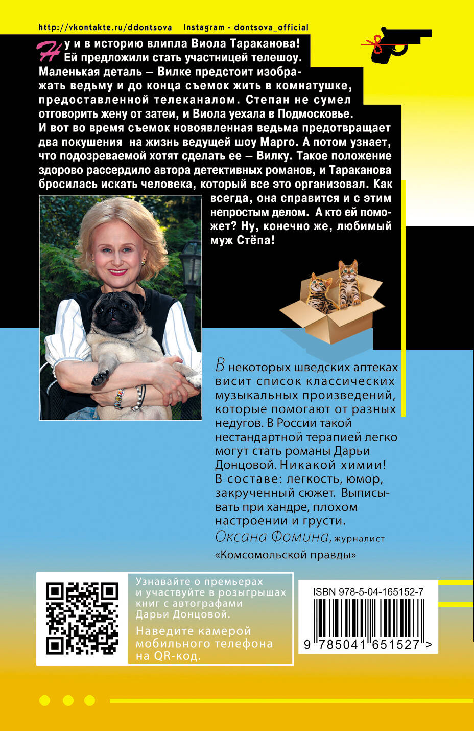 Ну и в историю влипла Виола Тараканова! Ей предложили стать участницей телешоу. Маленькая деталь - Вилке предстоит изображать ведьму и до конца съемок жить в комнатушке, предоставленной телеканалом. Степан не сумел отговорить жену от затеи, и Виола уехала в Подмосковье. И вот во время съемок новоявленная ведьма предотвращает два покушения на жизнь ведущей шоу Марго. А потом узнает, что подозреваемой хотят сделать ее - Вилку. Такое положение здорово рассердило автора детективных романов, и Тараканова бросилась искать человека, который все это организовал. Как всегда, она справится и с этим непростым делом. А кто ей поможет? Ну конечно же, любимый муж Стёпа! Дарья Донцова - самый популярный и востребованный автор в нашей стране, любимица миллионов читателей. В России продано более 200 миллионов экземпляров ее книг. Ее творчество наполняет сердца и души светом, оптимизмом, радостью, уверенностью в завтрашнем дне! «Донцова невероятная работяга! Я не знаю ни одного другого писателя, который столько работал бы. Я отношусь к ней с уважением, как к образцу писательского трудолюбия. Женщины нуждаются в психологической поддержке и получают ее от Донцовой. Я и сама в свое время прочла несколько романов Донцовой. Ее читают очень разные люди. И очень занятые бизнес-леди, чтобы на время выключить голову, и домохозяйки, у которых есть перерыв 15-20 минут между отвести-забрать детей». - Галина Юзефович, литературный критик| Издательство | Эксмо |