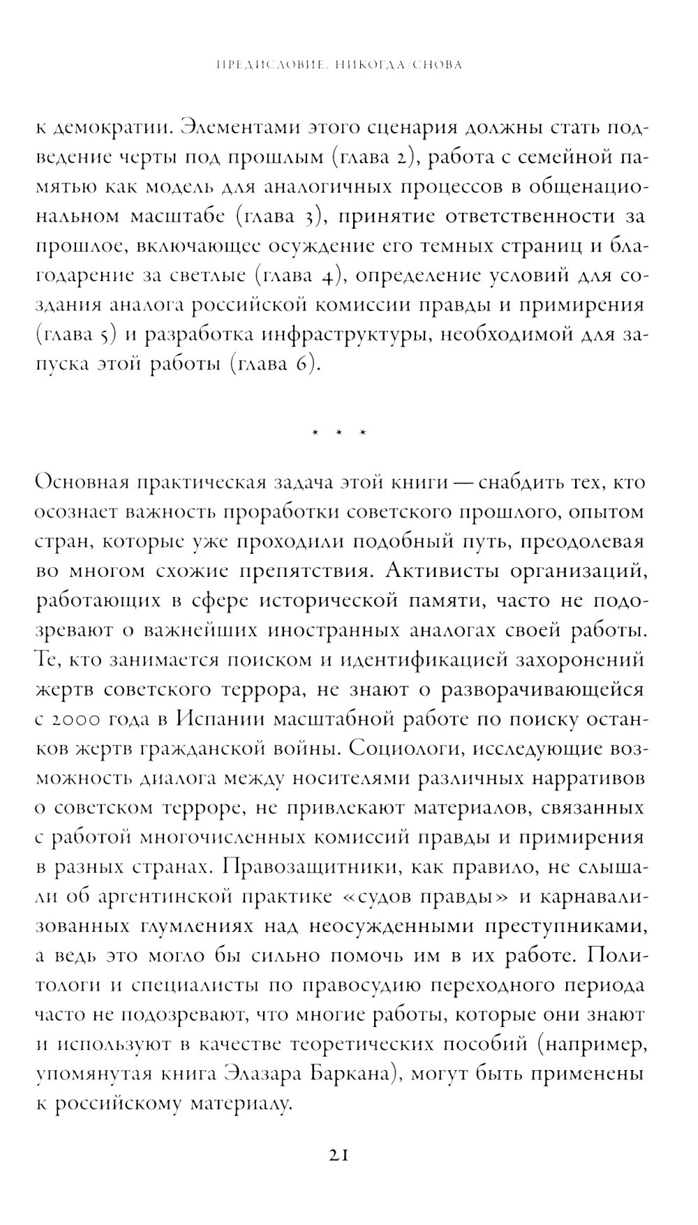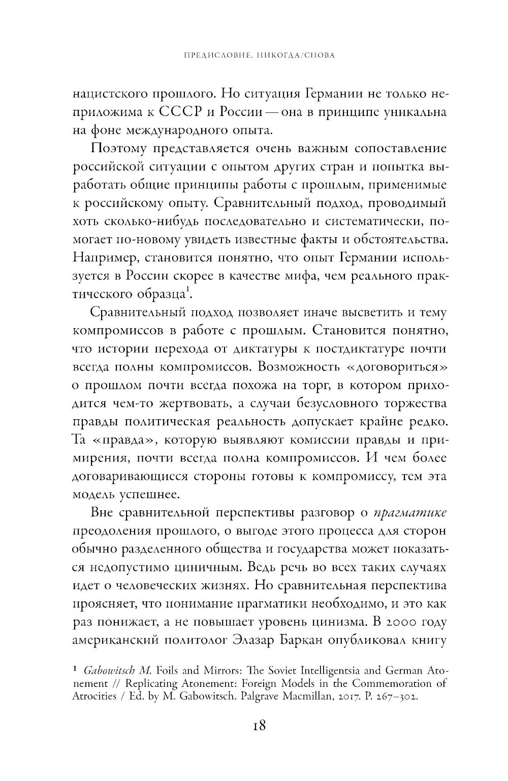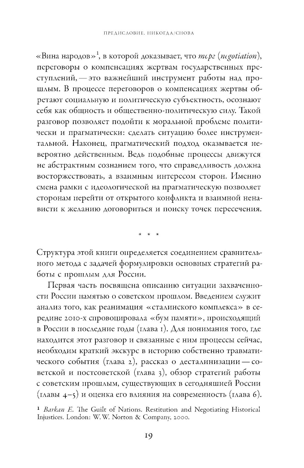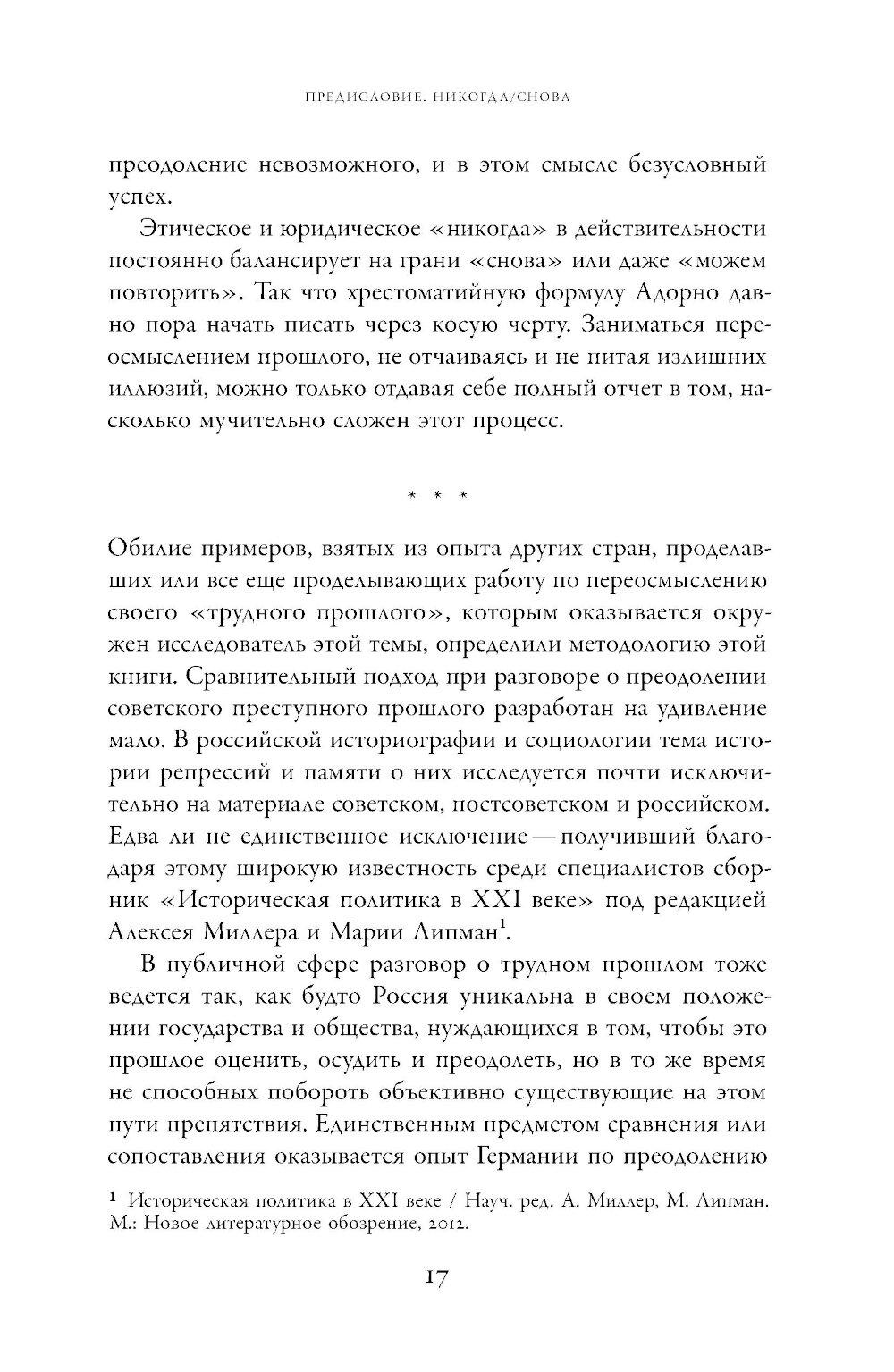 Преступлениям советского времени в России до сих пор не дана значимая для всего общества юридическая и этическая оценка. Отсутствие такой оценки сталинского государственного террора и советского тоталитарного прошлого препятствует тому, чтобы современная Россия распрощалась с этим наследием. Пока все сограждане не примут на себя ответственность за прошлое, оно останется незавершенным и будет препятствовать построению современной демократии. За последние десятилетия путь от диктатуры к демократии проделало множество стран, выработав богатый опыт проработки травматического прошлого ХX века, который в России почти не известен. В книге впервые на русском языке описаны ключевые модели работы с памятью о государственных преступлениях и проработки трудного прошлого, практикуемые в других странах, предложены стратегии адаптации этих моделей к условиям современной России.| Издательство | Новое литературное обозрение |